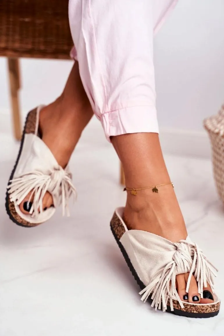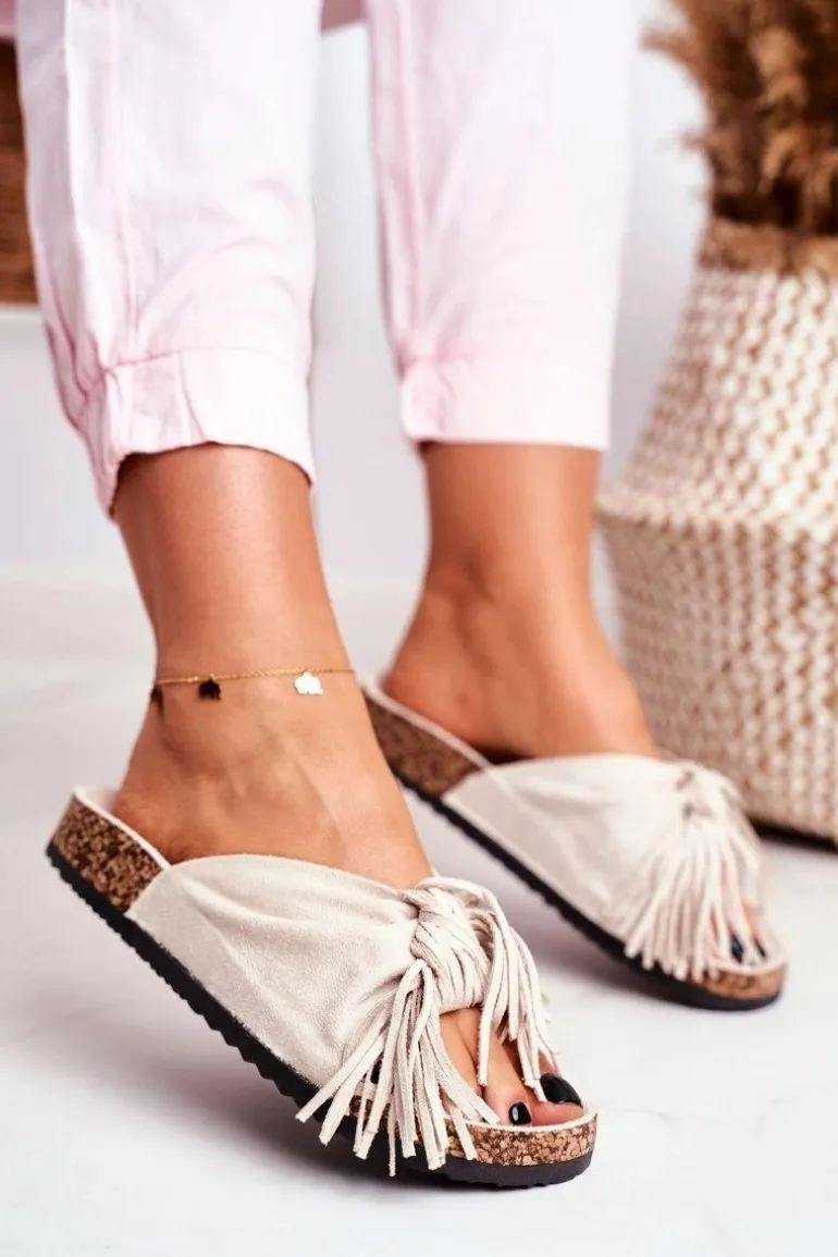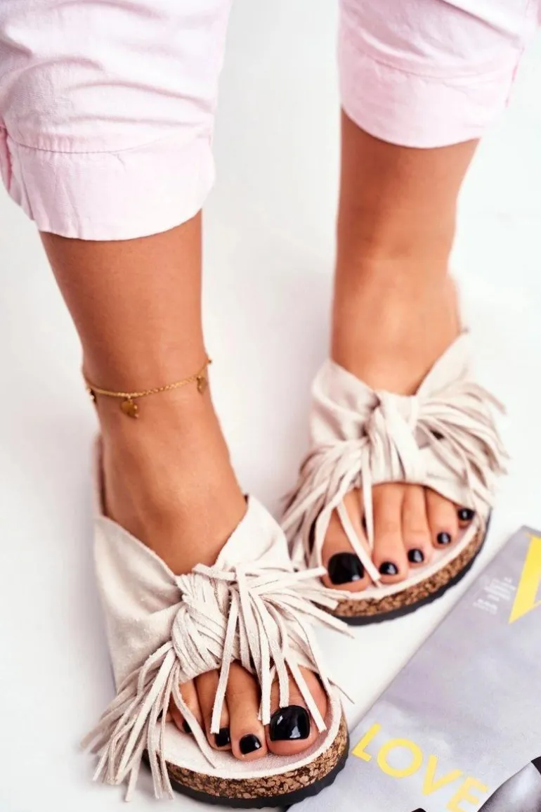 Damskie Kremowe Klapki Na Korku Frędzle Marina