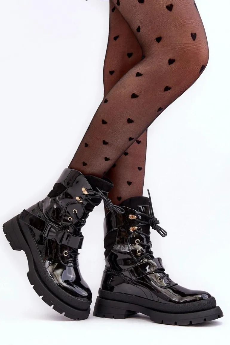 Damskie botki w stylu workerów zostały wykonane z eko skóry. Osadzone na płaskim obcasie oraz platformie ze żłobieniami. Model klasycznie sznurowany. Cholewka ozdobiona paskiem. Noski zaokrąglone. Zapiętek usztywniony. Ten model na pewno wykorzystasz w wielu stylizacjach! Przy wyborze rozmiaru prosimy sugerować się tabelą rozmiarów.