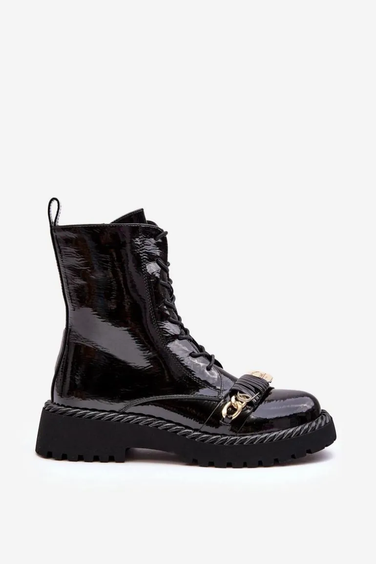 Damskie botki w stylu workerów zostały wykonane z wysokiej jakości eko skóry. Posiadają suwak z boku cholewki ułatwiający zakładanie obuwia. Botki osadzono na płaskim obcasie oraz delikatnej platformie ze żłobieniami. Posiadają w środku ocieplenie kocem obuwniczym. Z przodu złote ozdoby z tworzywa sztucznego. Ten model na pewno wykorzystasz w wielu stylizacjach! Przy wyborze rozmiaru prosimy sugerować się tabelą rozmiarów.