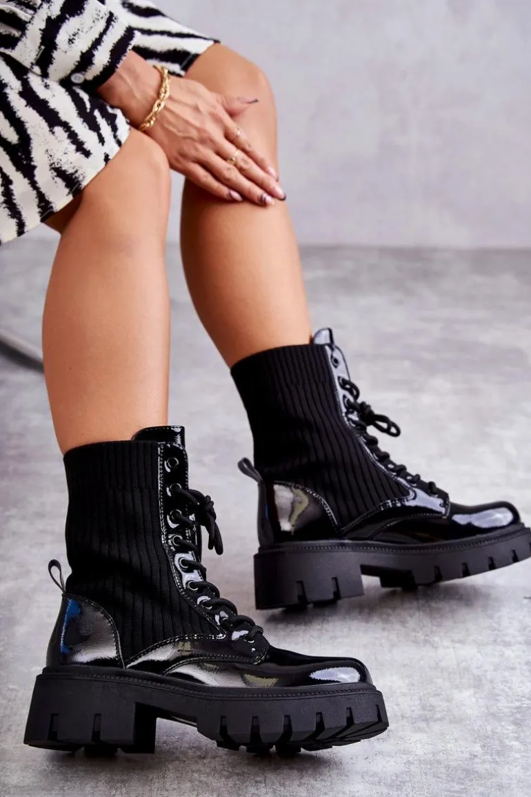 Modne botki damskie zostały wykonane z połączenia eko skóry oraz materiału tekstylnego w formie skarpety. Model klasycznie sznurowany. Botki zostały osadzone na platformie oraz płaskim obcasie. Ocieplone częściowo — na języku oraz wkładce. Model z usztywnianym zapiętkiem. Idealnie będą komponować się z krótkimi sukienkami, spódniczkami, a także spodniami. Przy wyborze rozmiaru prosimy sugerować się tabelą rozmiarów.