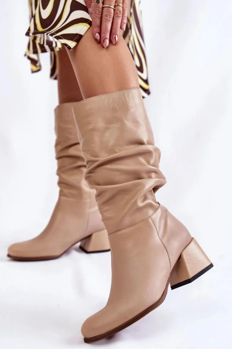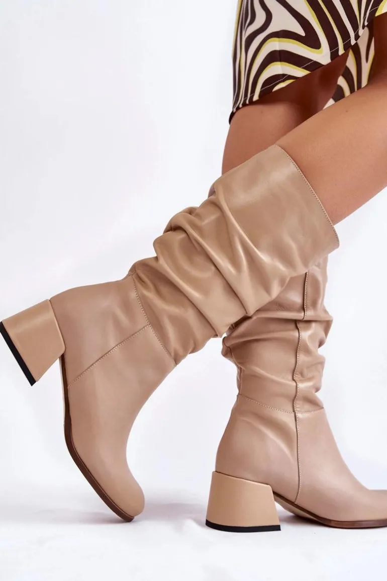 Buty marszczone. Damskie kozaki zostały wykonane z wysokiej jakości naturalnych skór. Model ten jest wsuwany. Kozaki osadzono na niskim obcasie w postaci szerszego słupka. Nie posiadają ocieplenia. Dodatkowo zapiętek jest usztywniany. Cholewka przyozdobiona delikatnymi marszczeniami. Ten model świetnie będzie prezentować się ze spódniczkami i krótkimi sukienkami. Przy wyborze rozmiaru prosimy sugerować się tabelą rozmiarów.