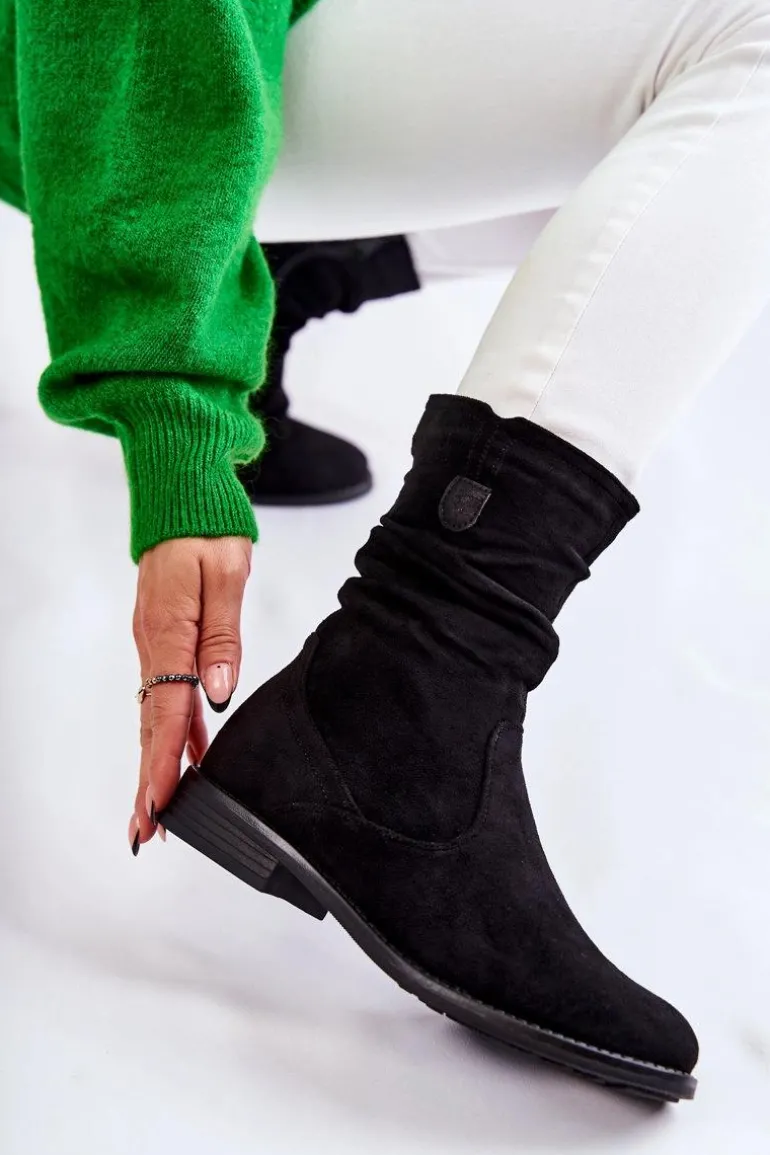 Wyjątkowe botki damskie z wysoką cholewką wykonaną z eko zamszu z marszczeniem. Osadzone na płaskim obcasie z antypoślizgową podeszwą. Zapiętek jest usztywniany. Botki wewnątrz zostały ocieplone miłym w dotyku kocem obuwniczym. Z boku posiadają suwak ułatwiający zakładanie obuwia. Koniecznie sprawdź także pozostałe botki dostępne w naszej ofercie! Przy wyborze rozmiaru prosimy sugerować się tabelą rozmiarów.