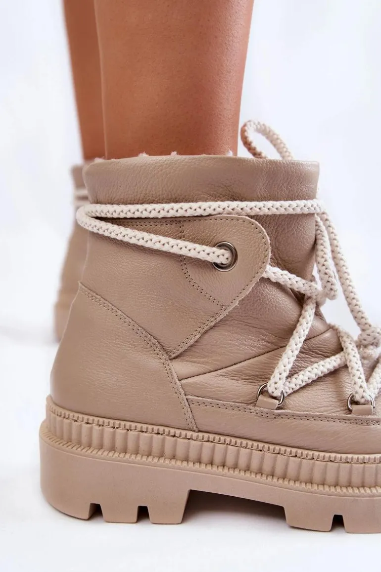Świetne, damskie śniegowce zostały wykonane z wysokiej jakości skór. Model posiada grube, solidne sznurowanie. Botki zostały osadzone na płaskim obcasie oraz platformie ze żłobieniami. Śniegowce posiadają ocieplenie w postaci futerka oraz usztywniany zapiętek. Ten model z pewnością przyda się każdej miłośniczce ciepłego i wygodnego obuwia! Przy wyborze rozmiaru prosimy sugerować się tabelą rozmiarów.