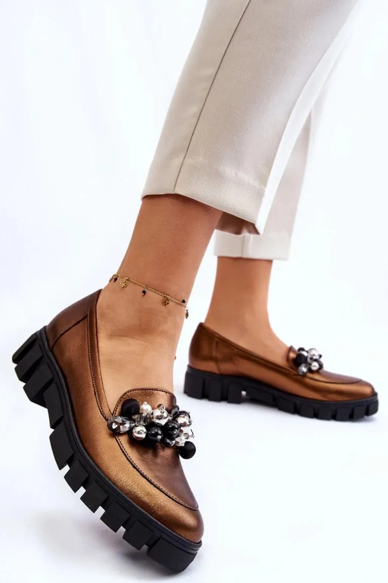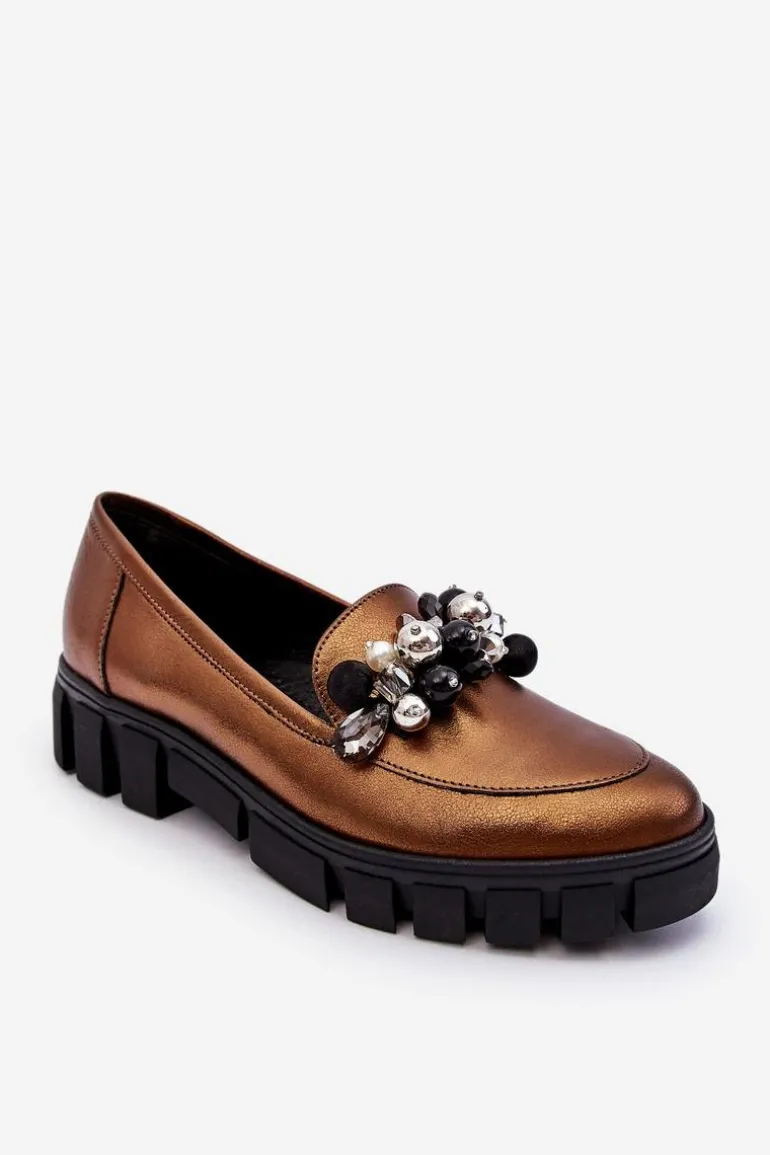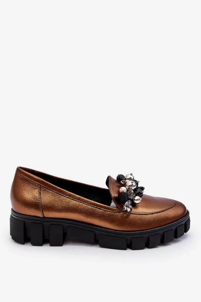 Modne, damskie mokasyny zostały osadzone na płaskim obcasie i platformie ze żłobieniami po bokach. Ozdobione z przodu koralikami. Wykonane z naturalnej skóry. Wkładka jest niezwykle miękka i zapewni wygodę podczas użytkowania. Zapiętek jest usztywniany. Świetny model do wielu stylizacji. Idealny na sezon wiosenno-jesienny! Przy wyborze rozmiaru prosimy sugerować się tabelą rozmiarów.