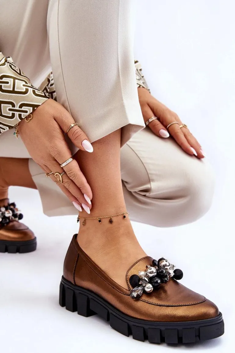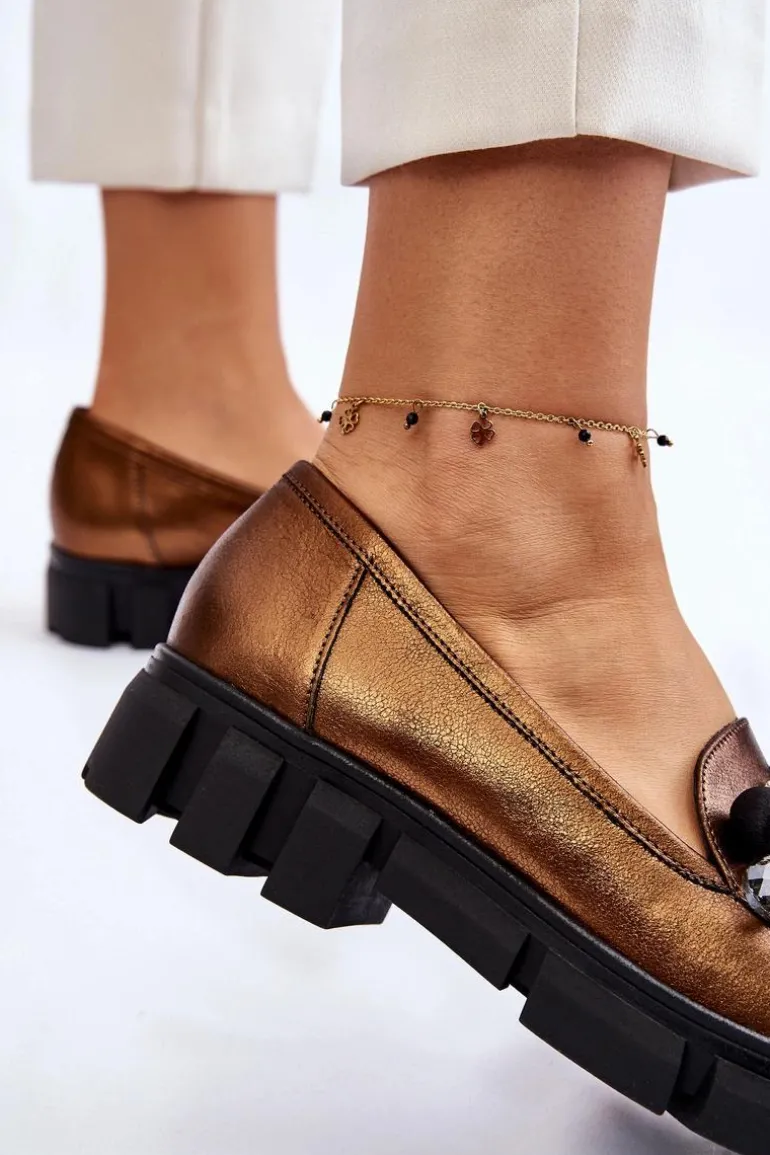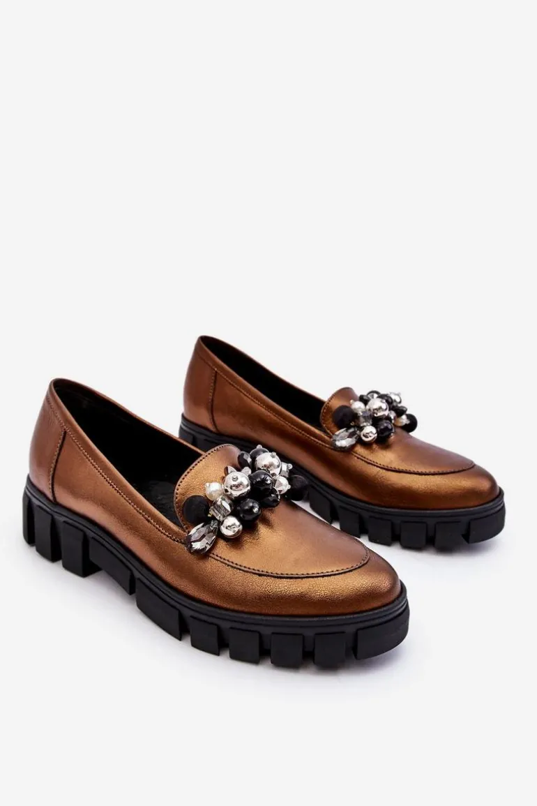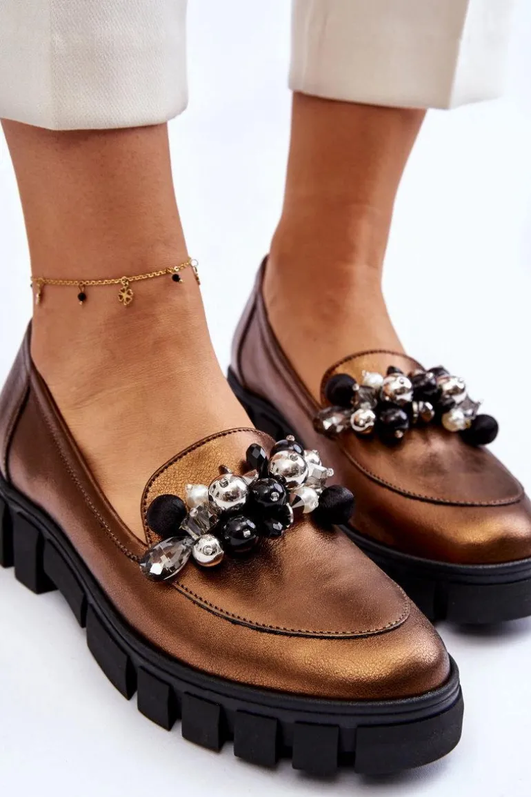 Modne, damskie mokasyny zostały osadzone na płaskim obcasie i platformie ze żłobieniami po bokach. Ozdobione z przodu koralikami. Wykonane z naturalnej skóry. Wkładka jest niezwykle miękka i zapewni wygodę podczas użytkowania. Zapiętek jest usztywniany. Świetny model do wielu stylizacji. Idealny na sezon wiosenno-jesienny! Przy wyborze rozmiaru prosimy sugerować się tabelą rozmiarów.