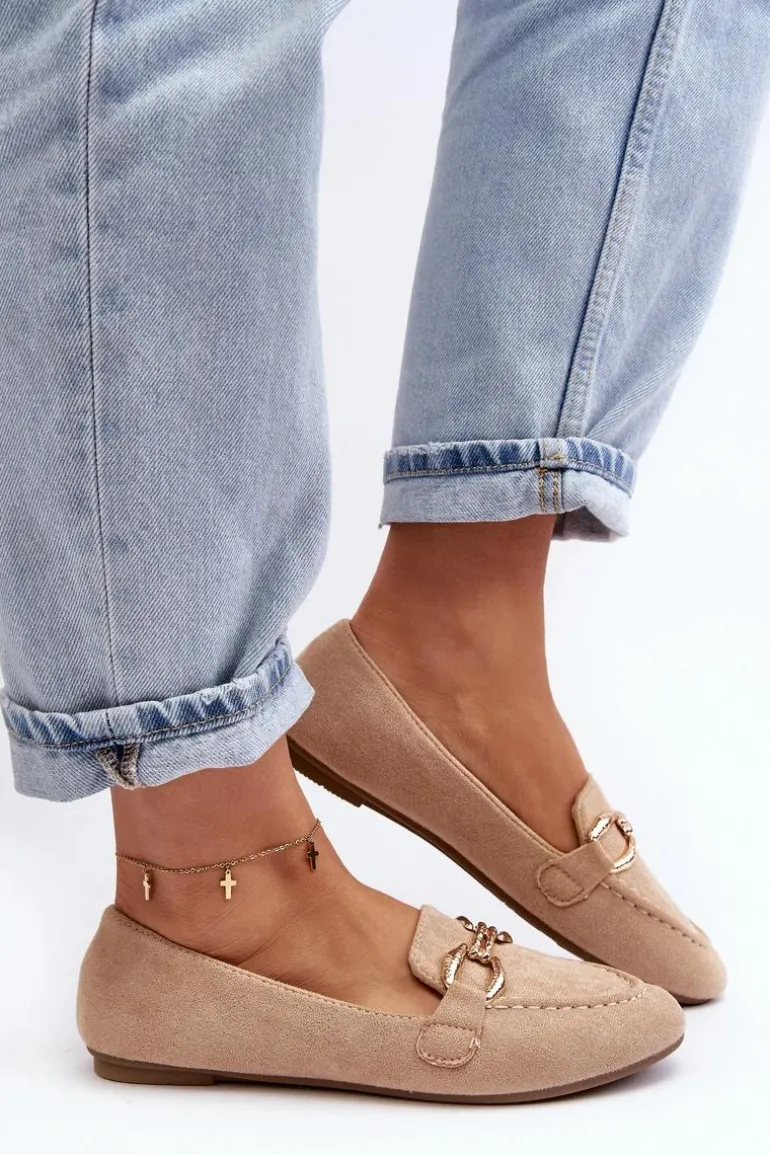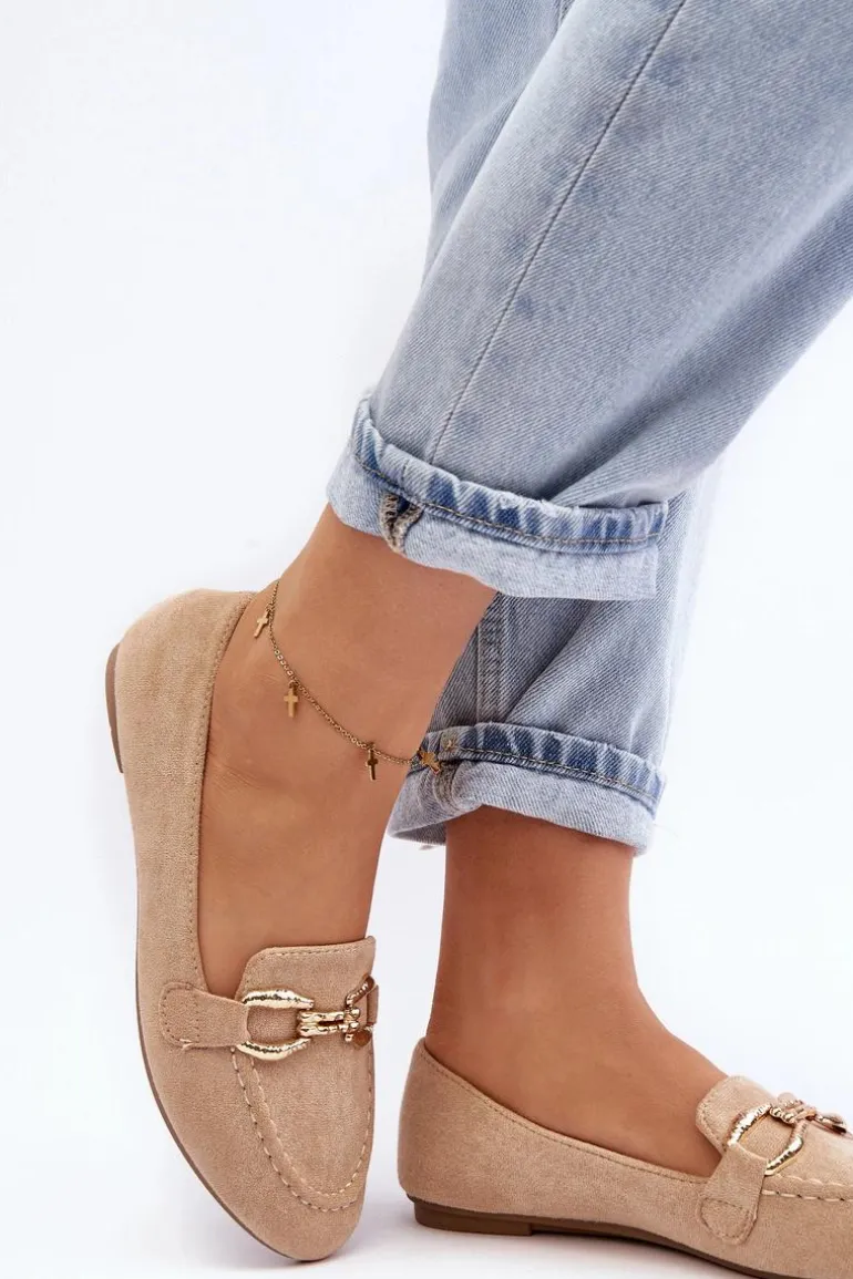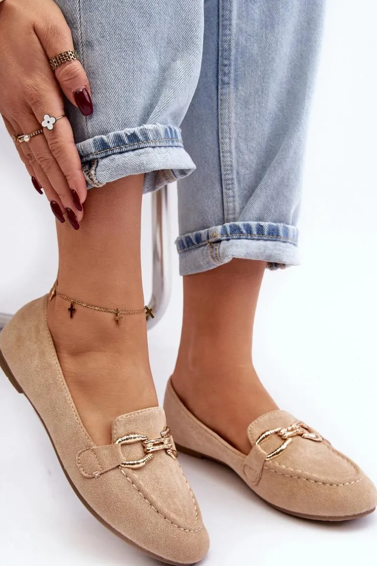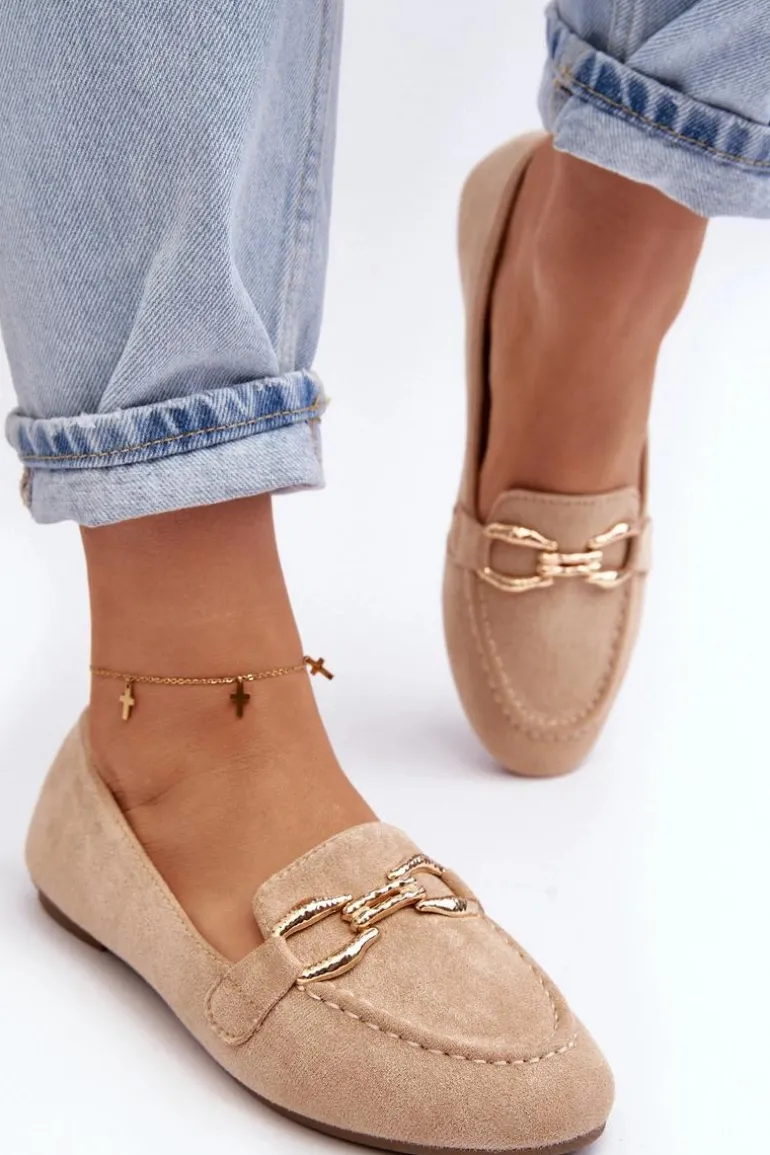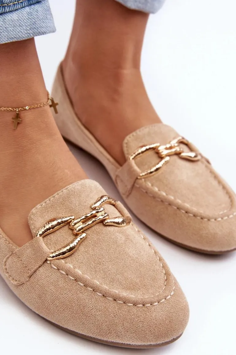 Stylowe mokasyny damskie to niezbędny element kobiecej garderoby! Wykonane z eko zamszu. Złota ozdoba z tworzywa sztucznego dodaje elegancji. Noski zaokrąglone. Miękka i profilowana wkładka z eko skóry gwarantuje komfort noszenia przez cały dzień. Koniecznie musisz je mieć! Przy wyborze rozmiaru prosimy sugerować się tabelą rozmiarów.