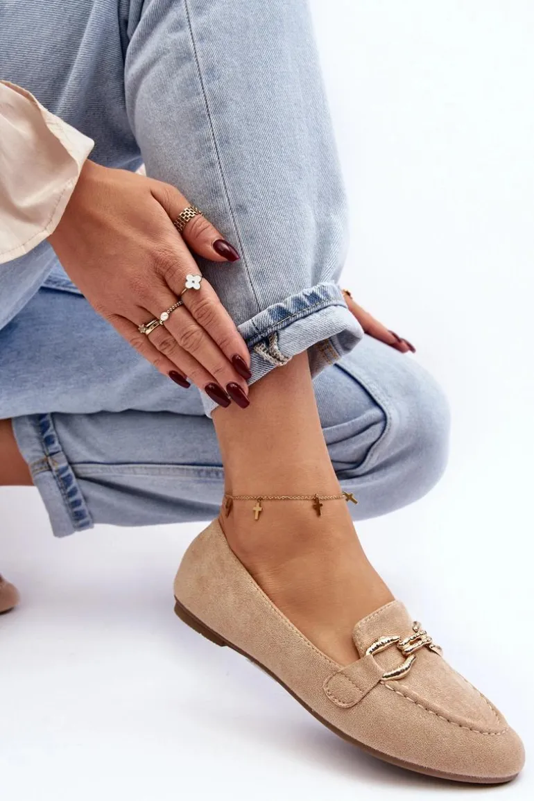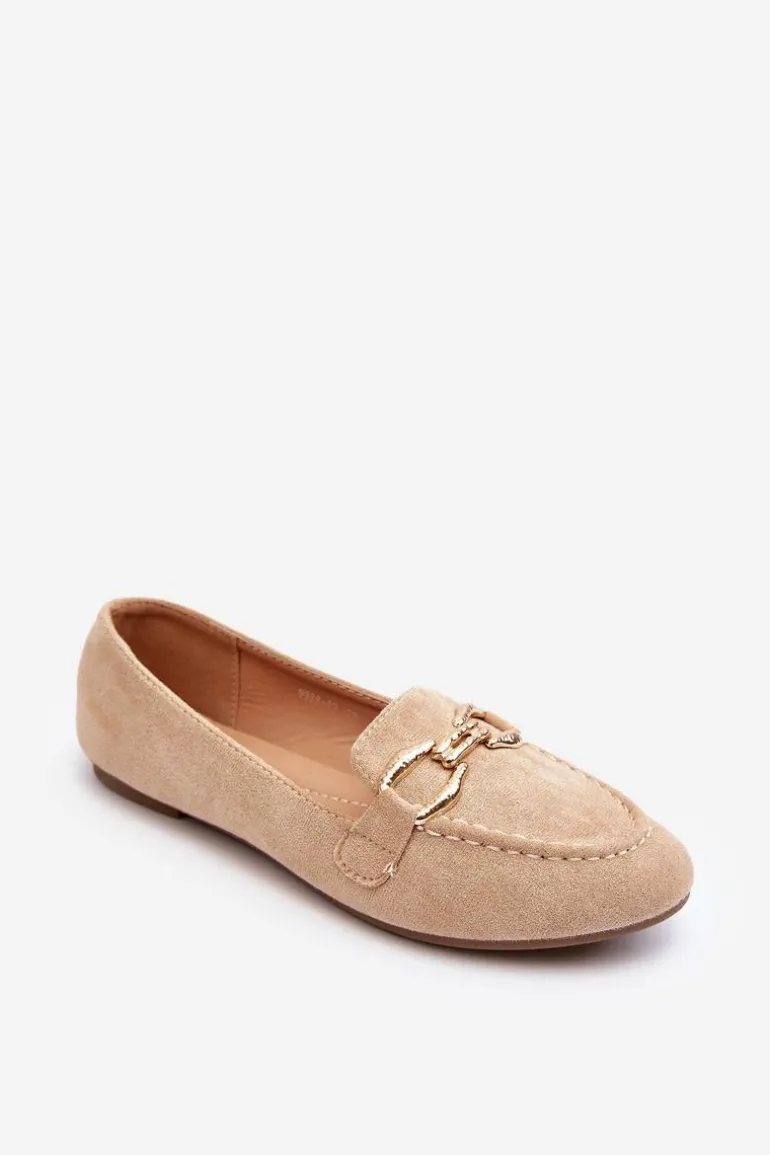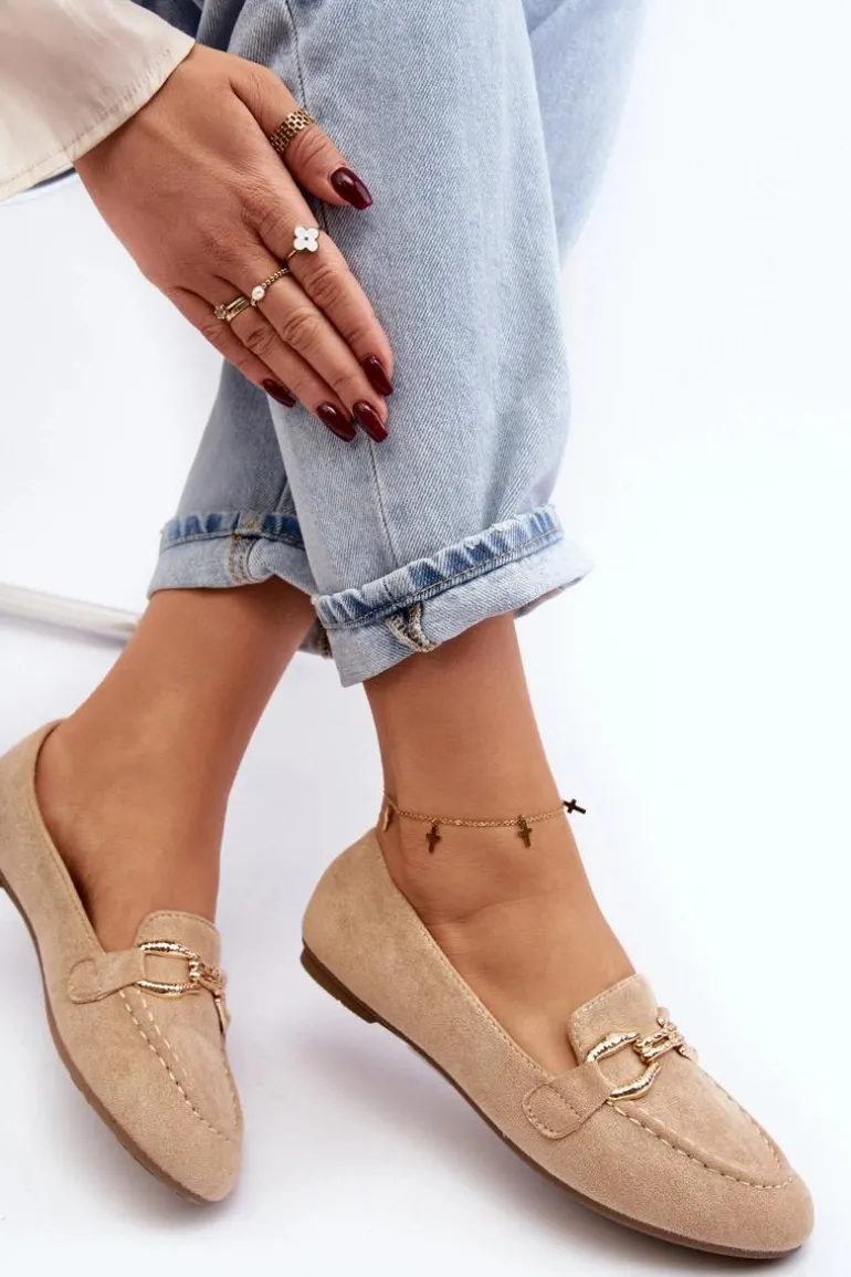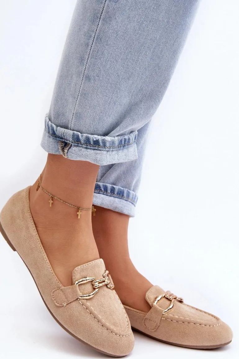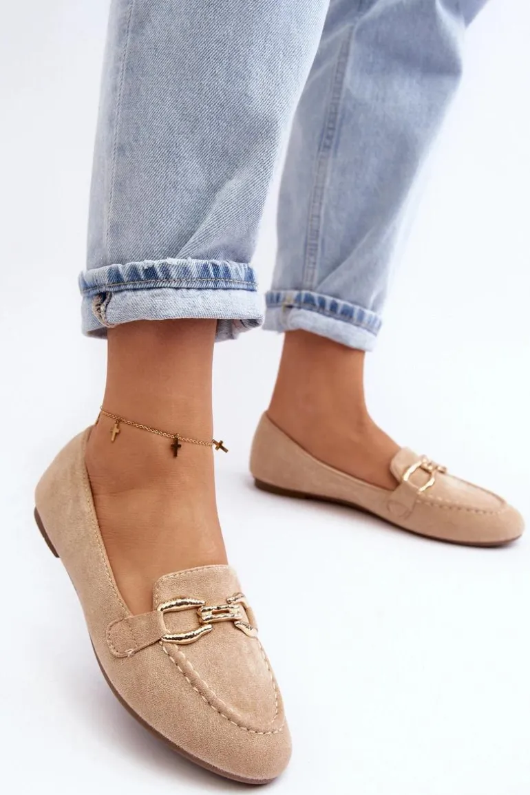 Stylowe mokasyny damskie to niezbędny element kobiecej garderoby! Wykonane z eko zamszu. Złota ozdoba z tworzywa sztucznego dodaje elegancji. Noski zaokrąglone. Miękka i profilowana wkładka z eko skóry gwarantuje komfort noszenia przez cały dzień. Koniecznie musisz je mieć! Przy wyborze rozmiaru prosimy sugerować się tabelą rozmiarów.