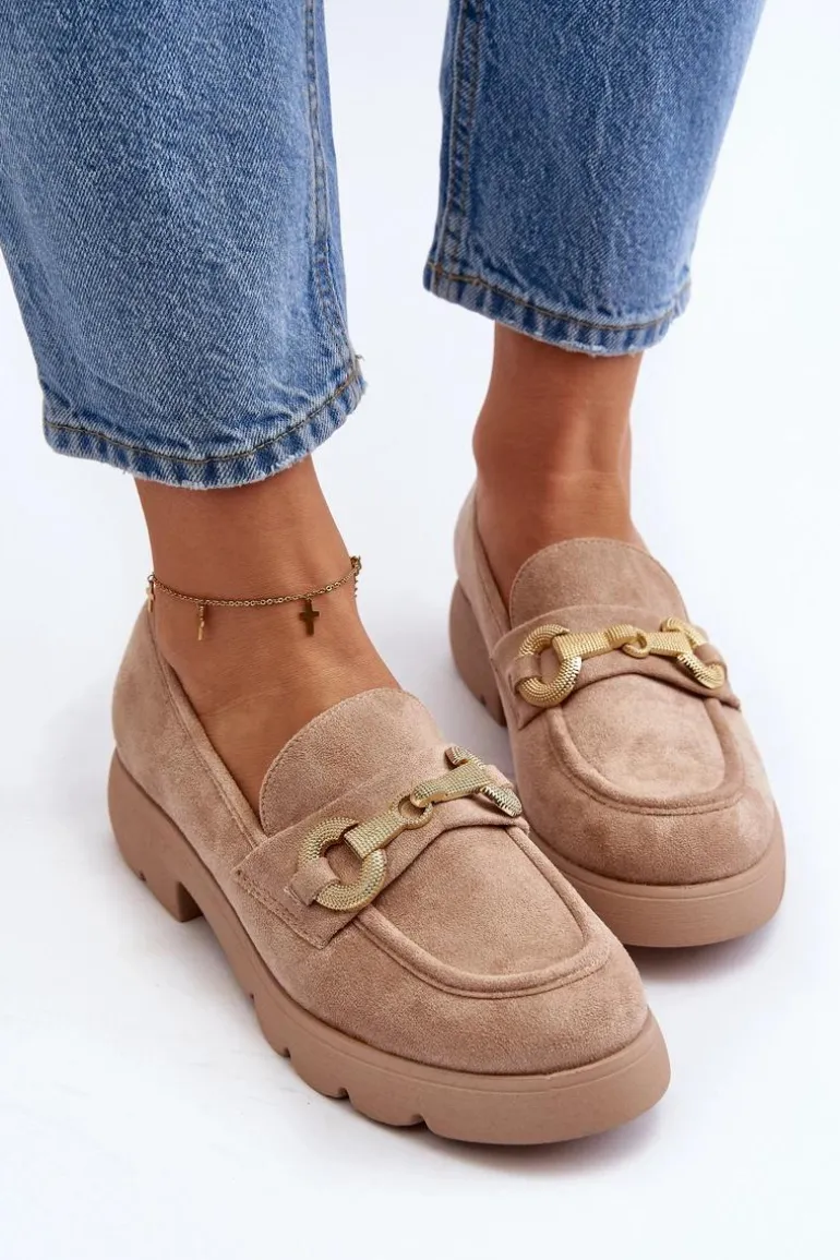 Mokasyny damskie wykonane z miłego w dotyku eko zamszu. Osadzona na płaskim obcasie. Noski zaokrąglone. Z przodu złota ozdoba. Wkładka z eko skóry zapewni wygodę podczas noszenia. Ten modny fason z pewnością wykorzystasz do wielu stylizacji! Przy wyborze rozmiaru prosimy sugerować się tabelą rozmiarów.