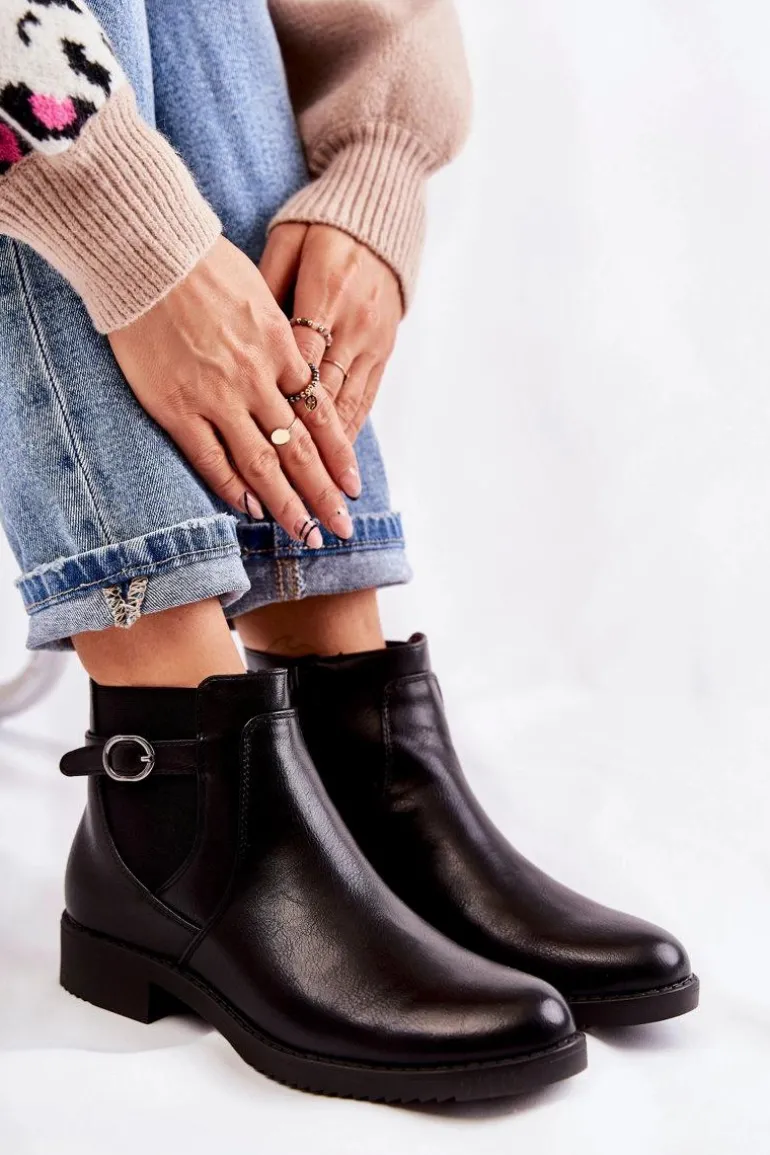 Damskie botki zostały wykonane z eko skóry. Posiadają ozdobną klamrę na cholewce oraz suwak ułatwiający zakładanie obuwia. Dodatkowo zapiętek w tych butach jest usztywniany. Osadzone na płaskim obcasie, co sprawia, że są niezwykle stabilne podczas użytkowania. Wnętrze botków zostało ocieplone miłym w dotyku kocem obuwniczym. Świetny model do wielu stylizacji! Przy wyborze rozmiaru prosimy sugerować się tabelą rozmiarów.
