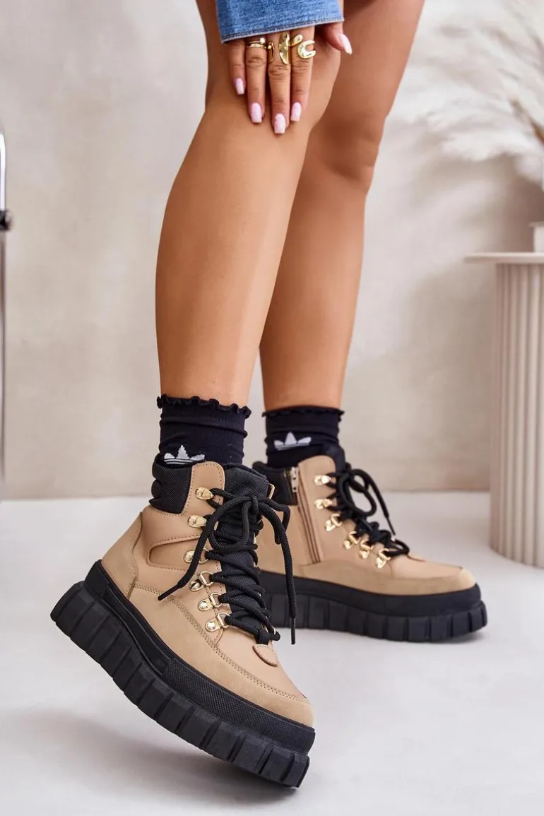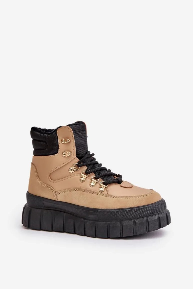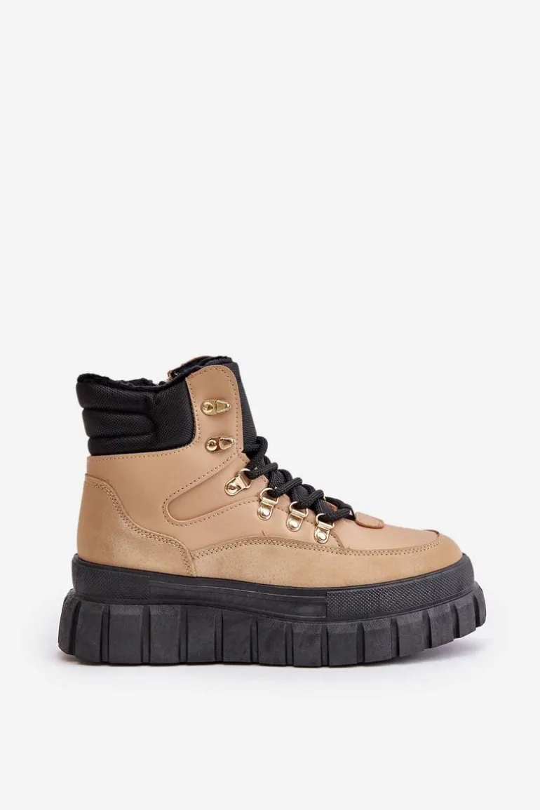 Damskie Ocieplane Botki Trapery Na Platformie Brązowe Jelenia