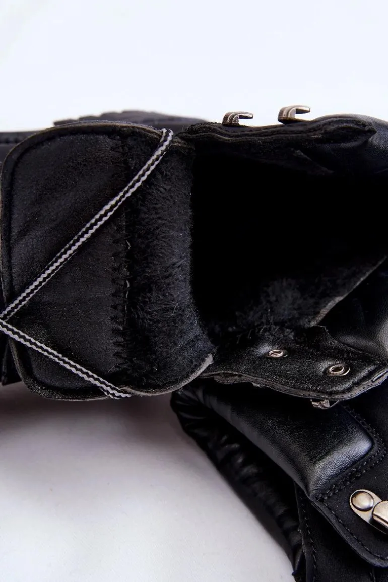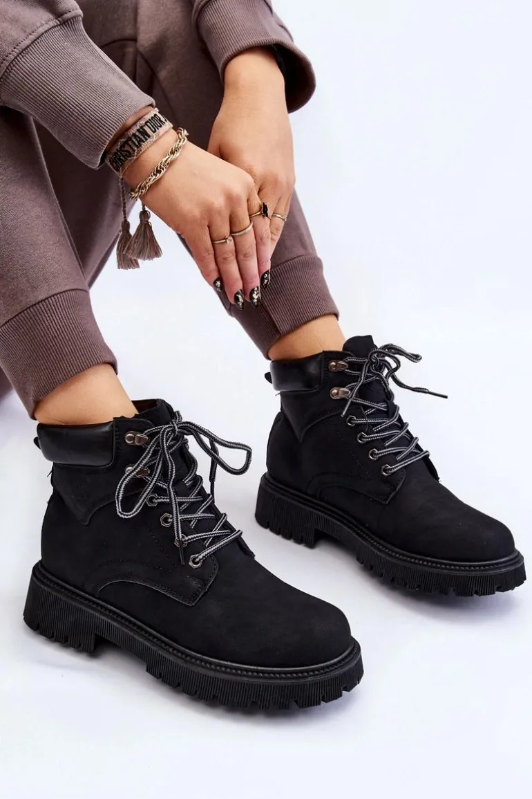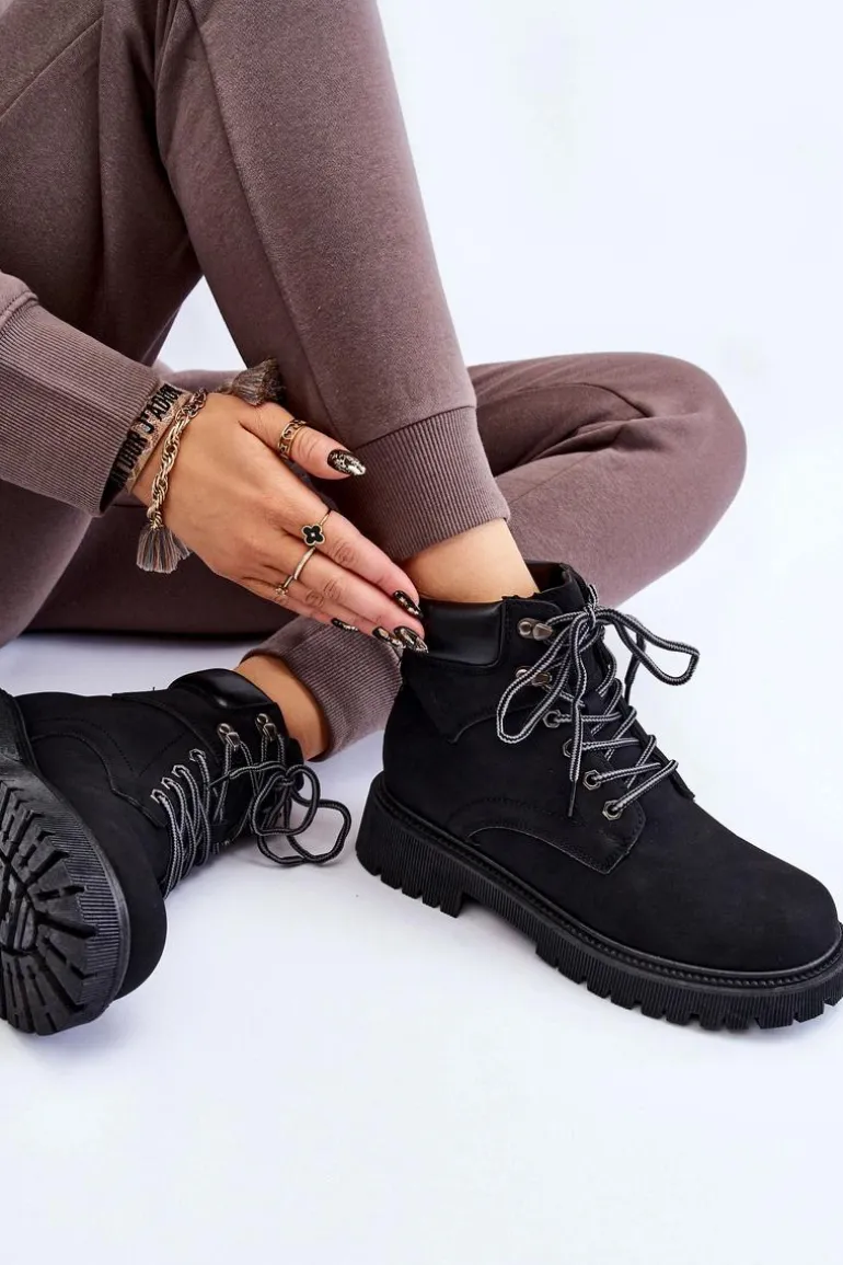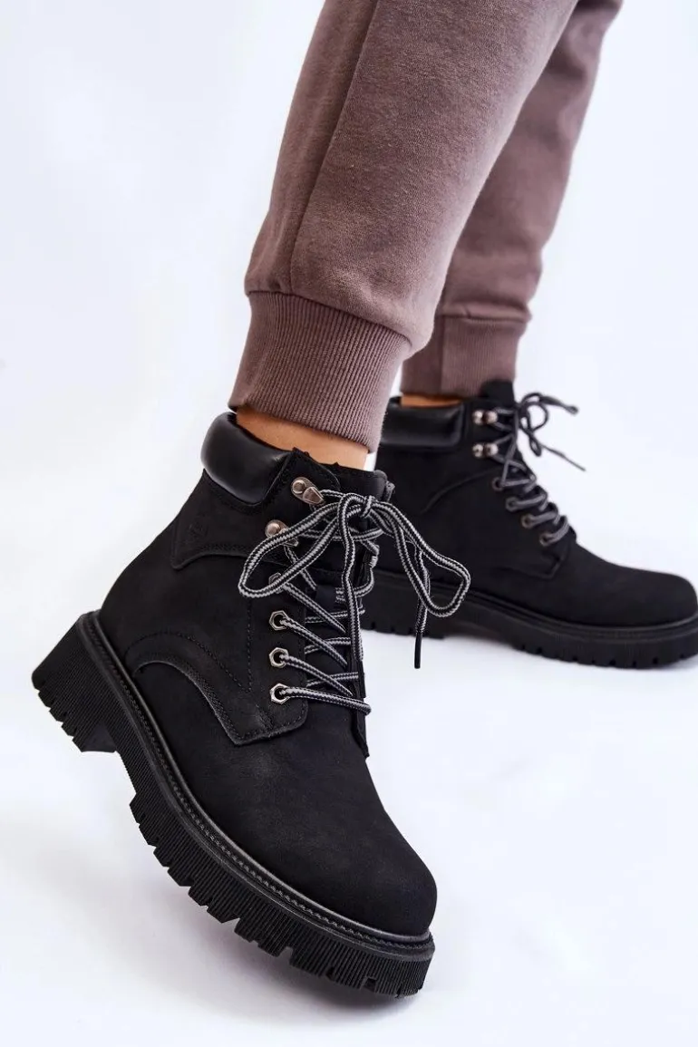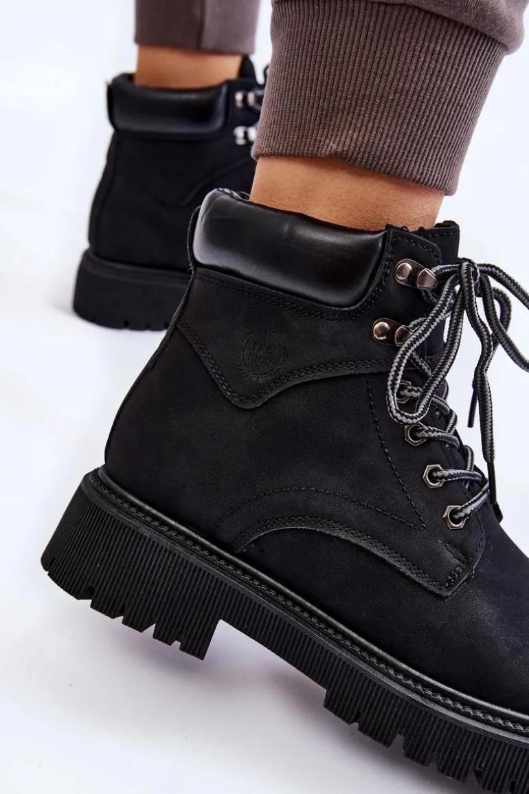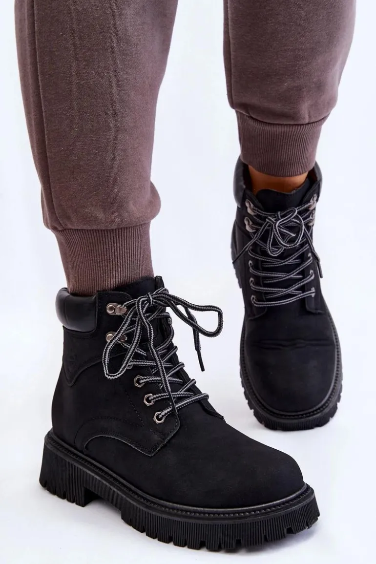 Damskie Ocieplane Botki Trapery Sznurowane Czarne Halfway