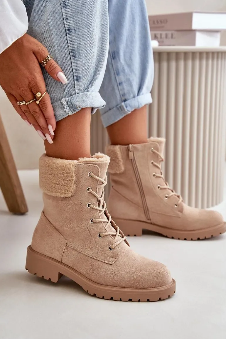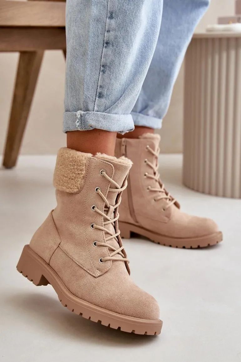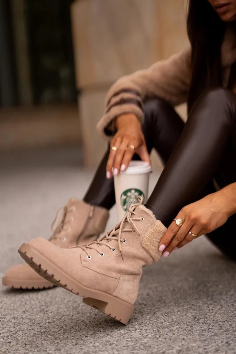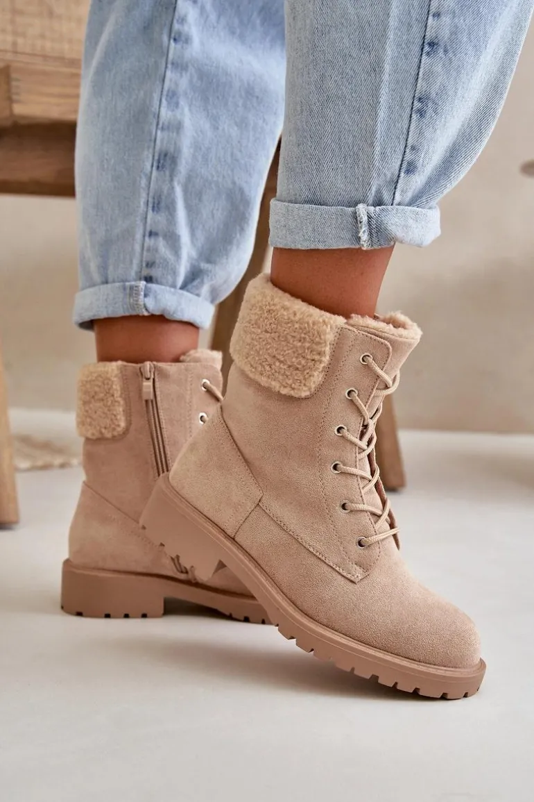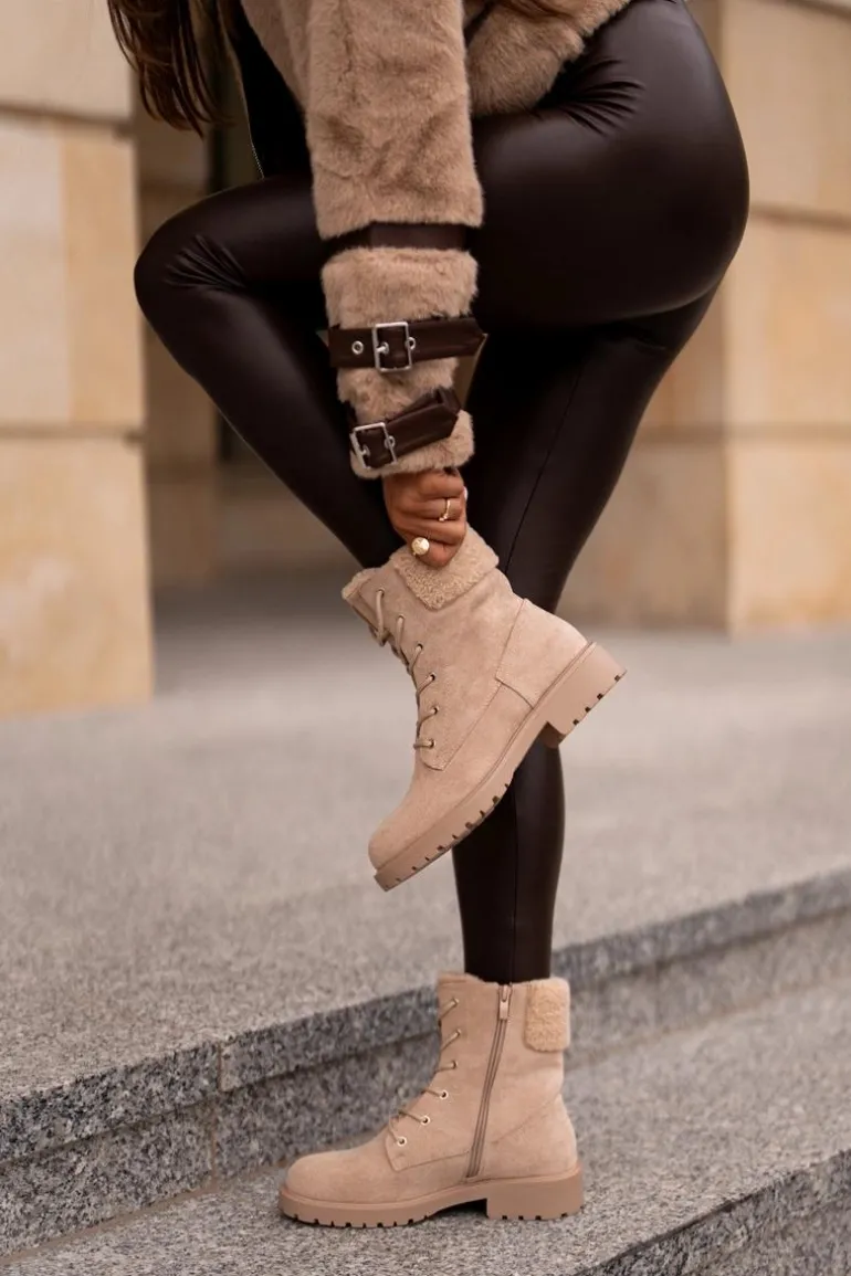 Damskie botki wykonane z miękkiego eko zamszu. Wnętrze ocieplone kocem obuwniczym, co zapewnia komfort w chłodniejsze dni. Góra ozdobiona stylowym kożuszkiem. Model sznurowany, z dodatkowym zapięciem na zamek, co ułatwia zakładanie i dopasowanie do stopy. Idealne na jesienno-zimowe spacery i codzienne stylizacje. Przy wyborze rozmiaru prosimy sugerować się tabelą rozmiarów.