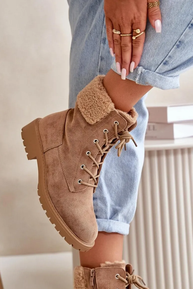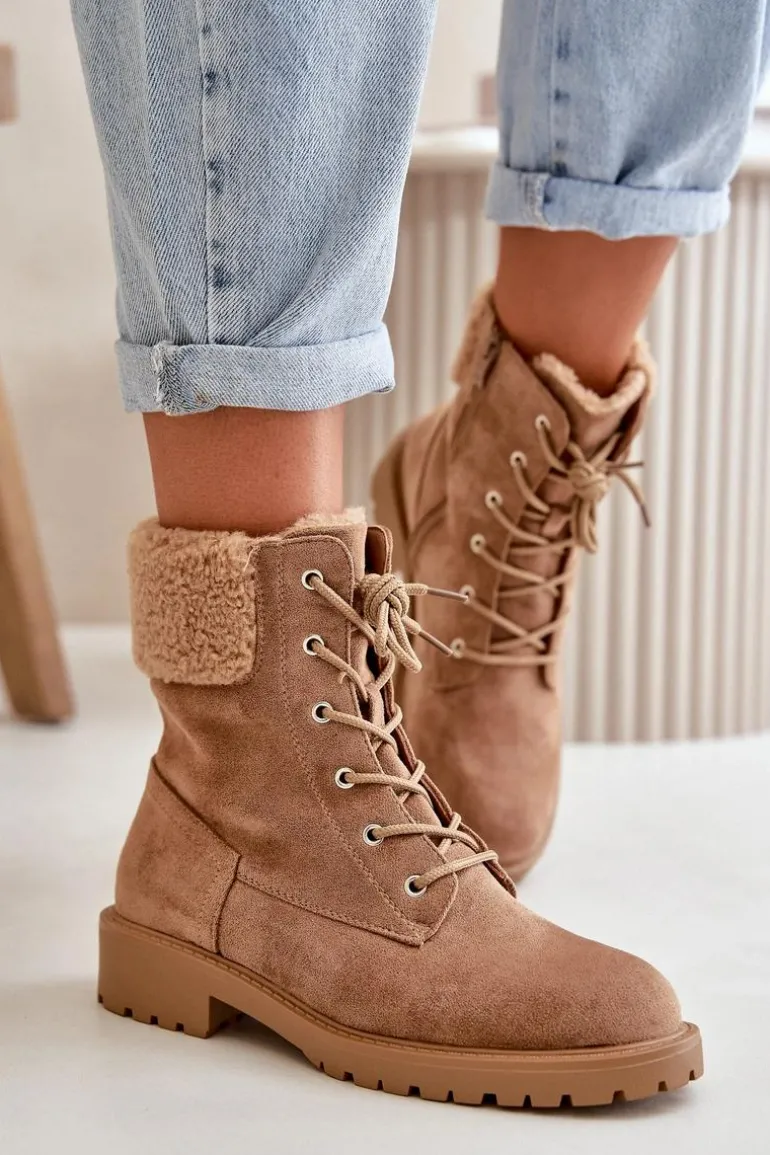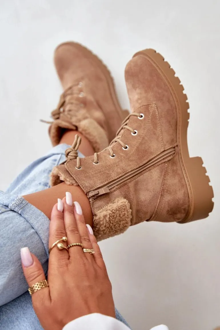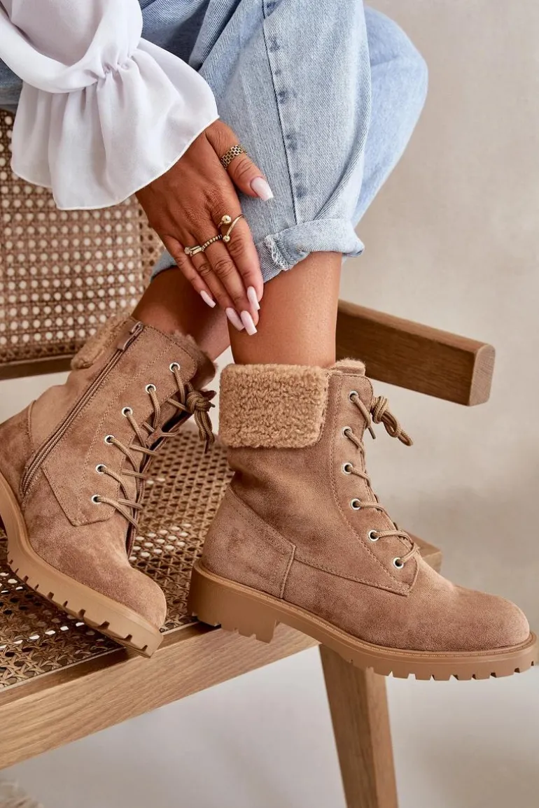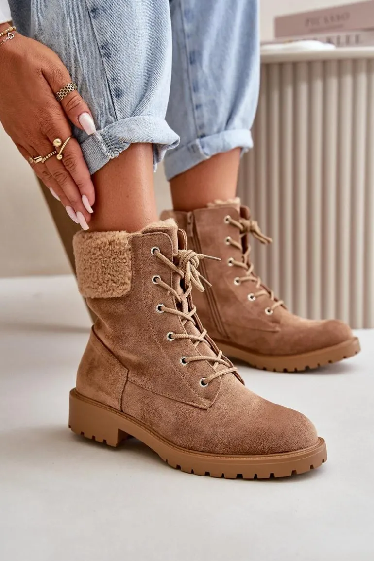 Damskie botki wykonane z miękkiego eko zamszu. Wnętrze ocieplone kocem obuwniczym, co zapewnia komfort w chłodniejsze dni. Góra ozdobiona stylowym kożuszkiem. Model sznurowany, z dodatkowym zapięciem na zamek, co ułatwia zakładanie i dopasowanie do stopy. Idealne na jesienno-zimowe spacery i codzienne stylizacje. Przy wyborze rozmiaru prosimy sugerować się tabelą rozmiarów.