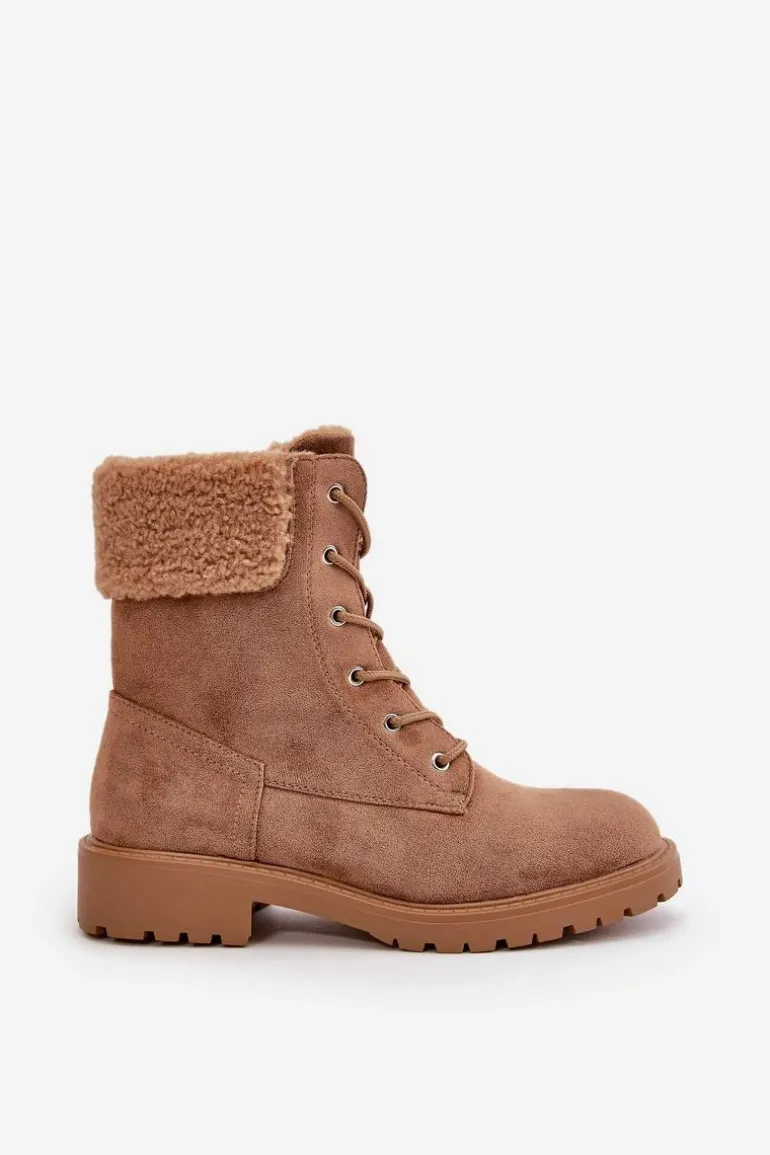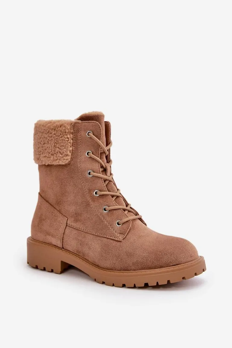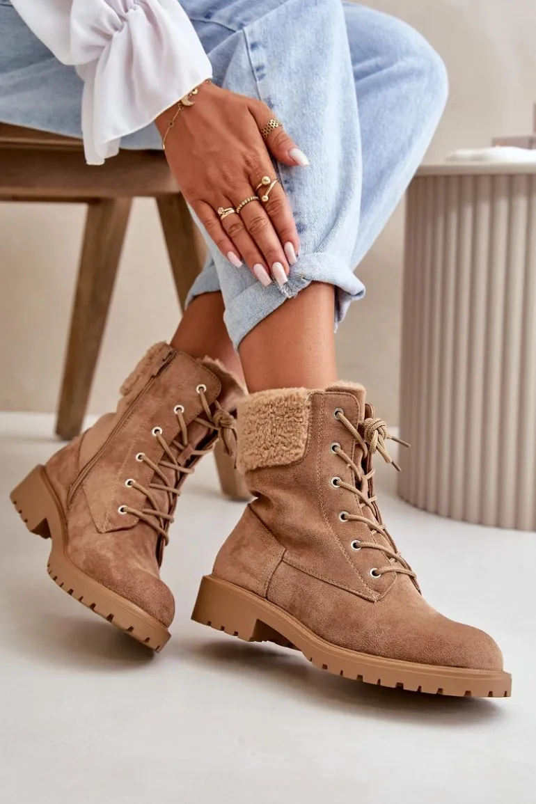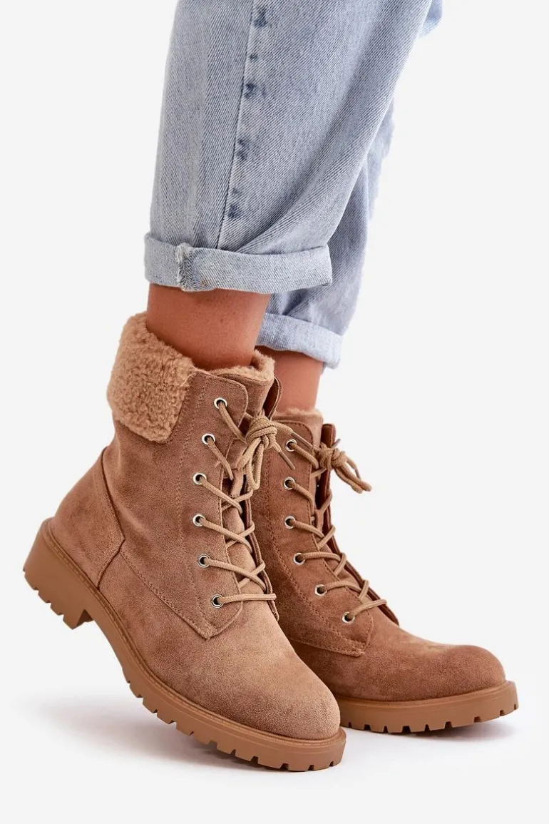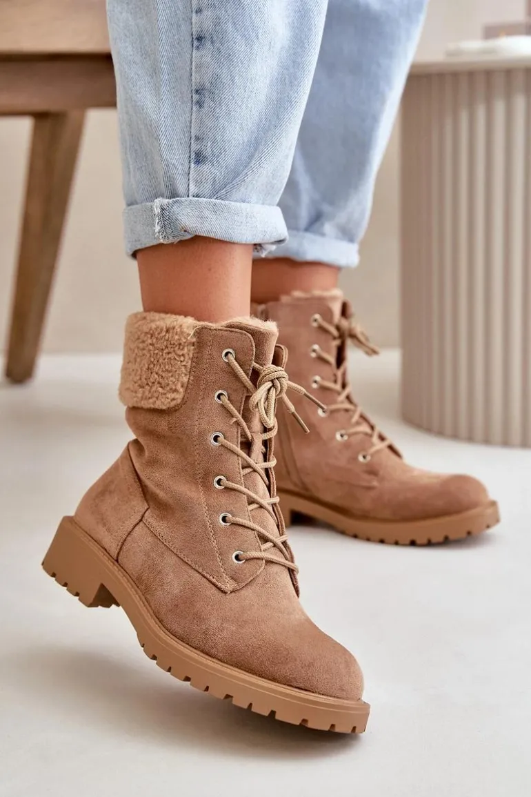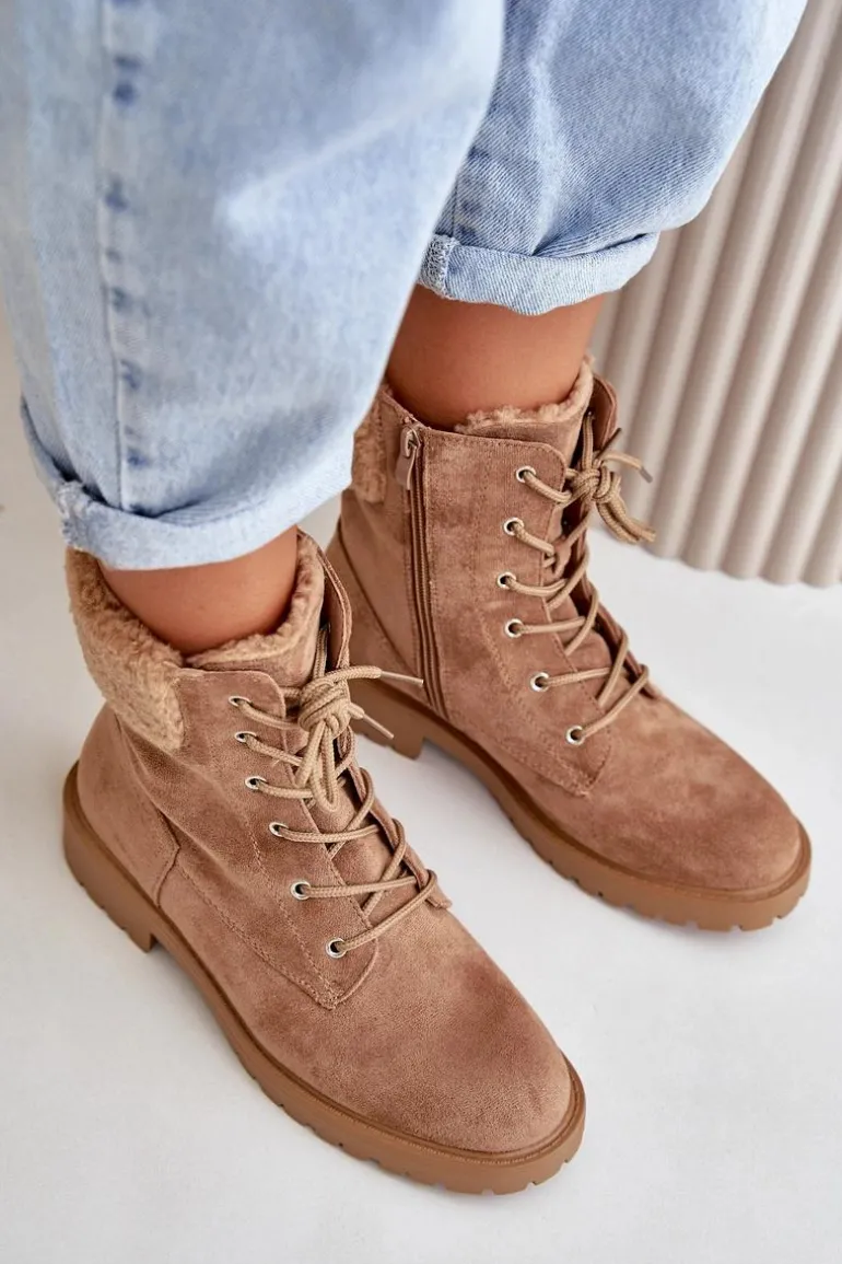 Damskie botki wykonane z miękkiego eko zamszu. Wnętrze ocieplone kocem obuwniczym, co zapewnia komfort w chłodniejsze dni. Góra ozdobiona stylowym kożuszkiem. Model sznurowany, z dodatkowym zapięciem na zamek, co ułatwia zakładanie i dopasowanie do stopy. Idealne na jesienno-zimowe spacery i codzienne stylizacje. Przy wyborze rozmiaru prosimy sugerować się tabelą rozmiarów.