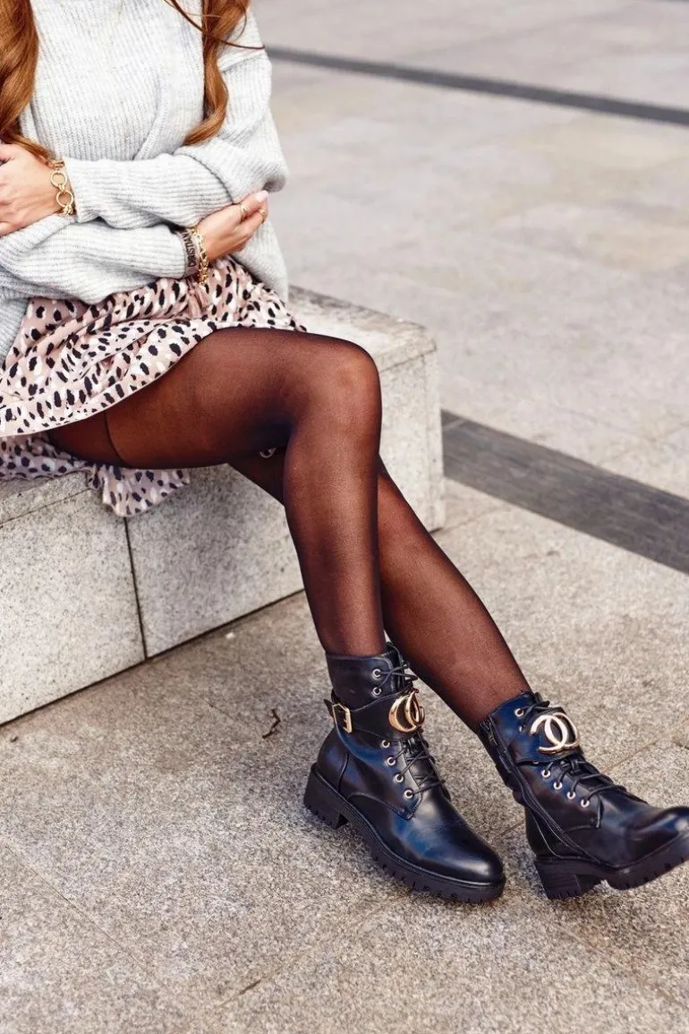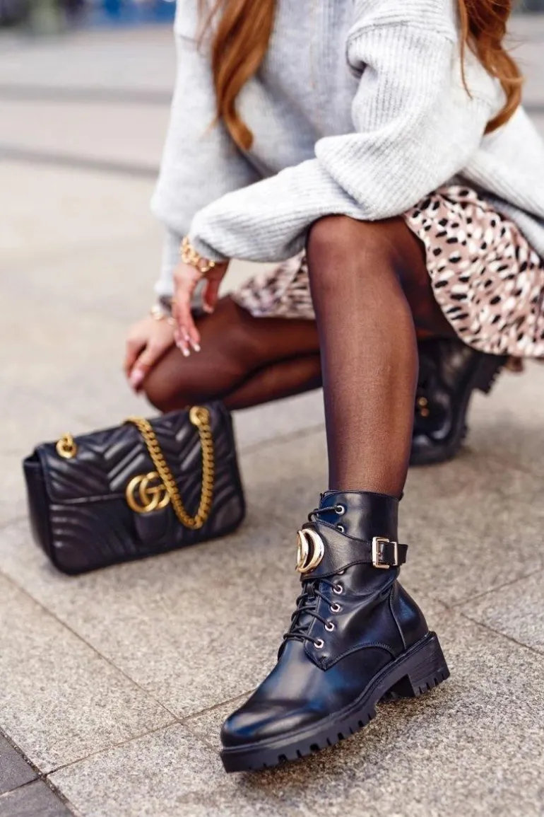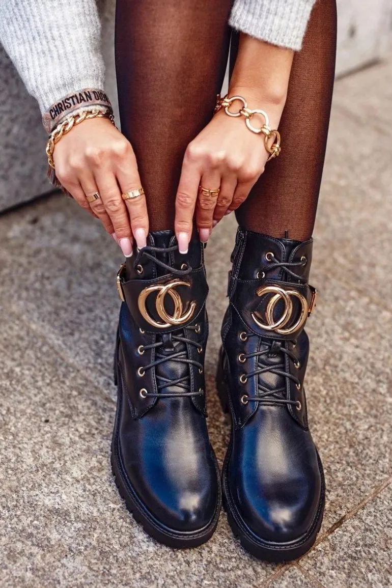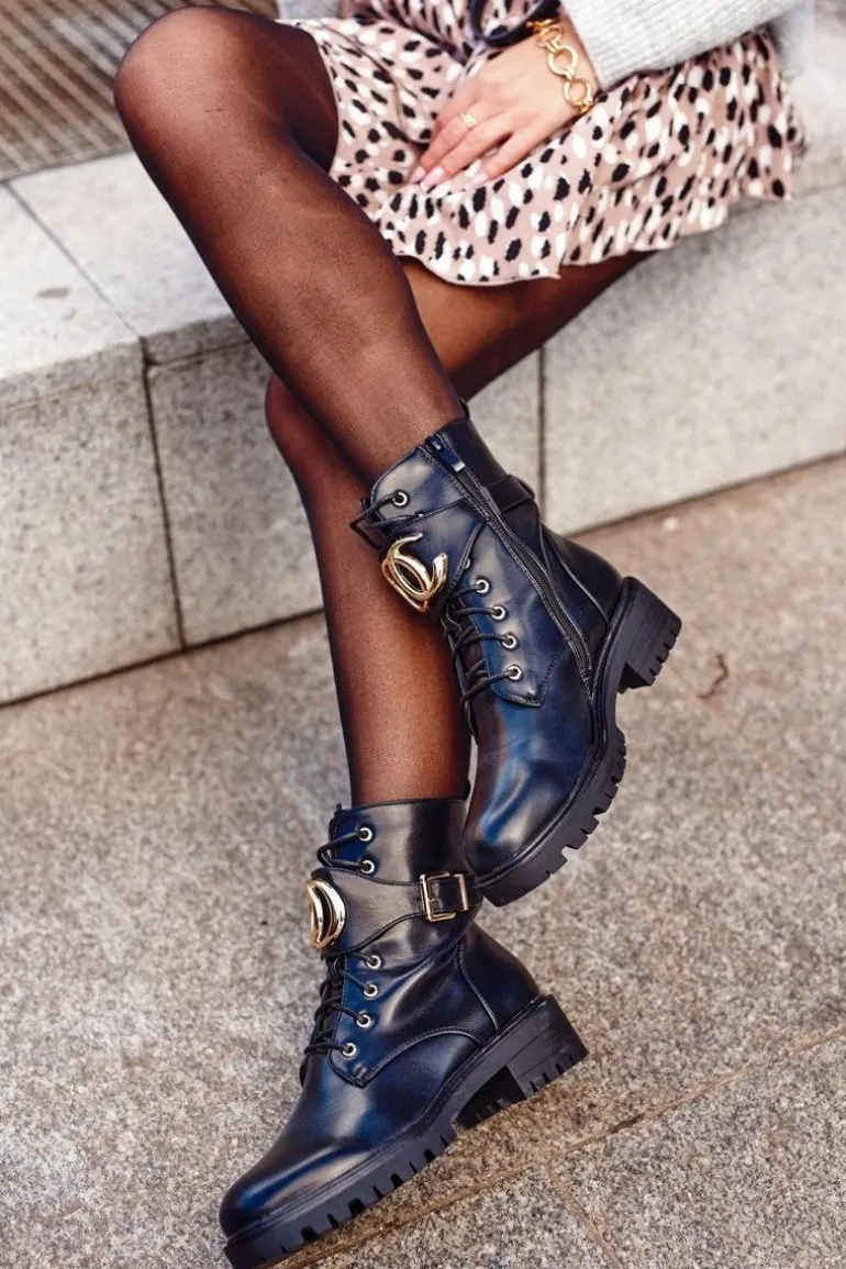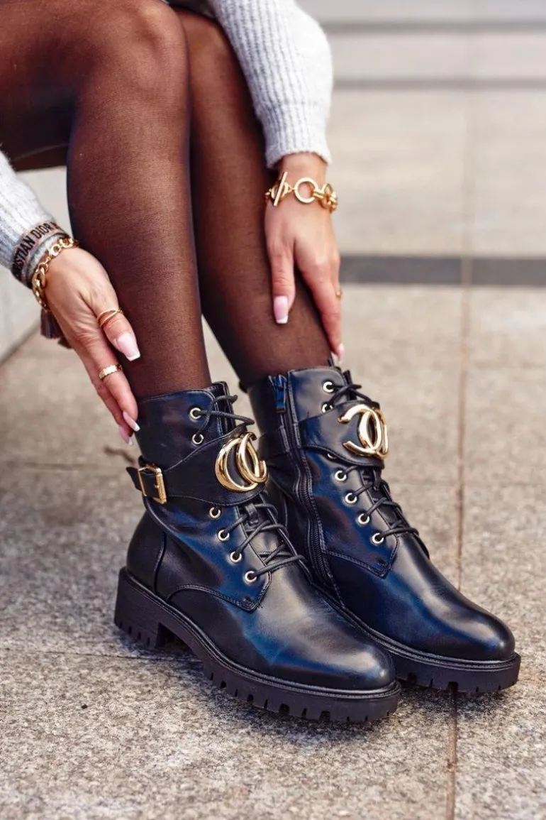 Damskie Ocieplane Botki Workery Złota Klamra Czarne Gold