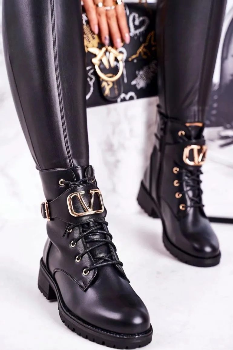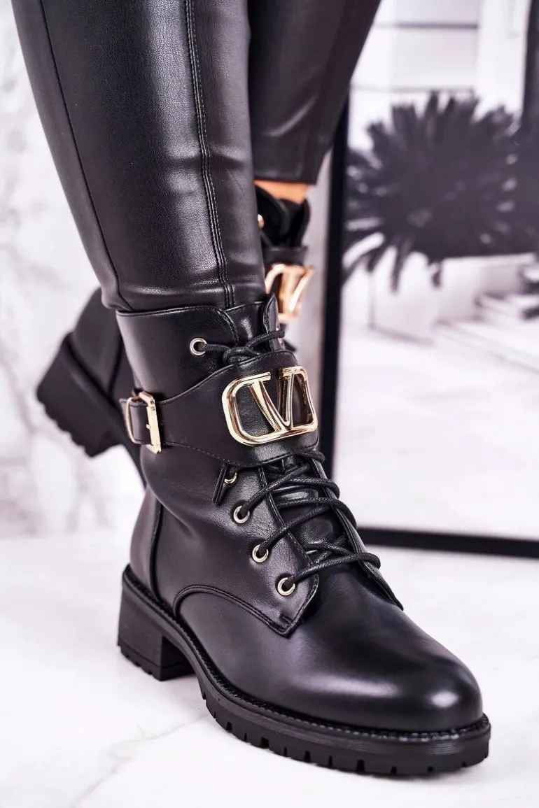 Damskie Ocieplane Botki Workery Złota Klamra Czarne Vera