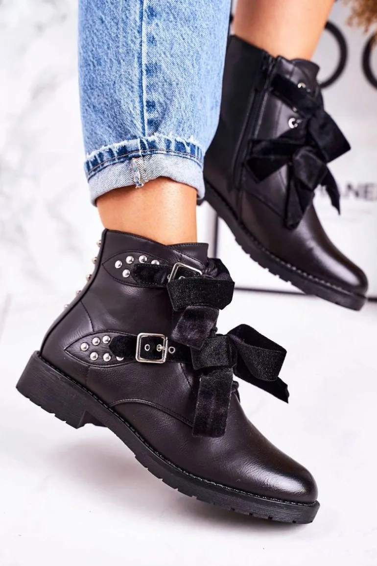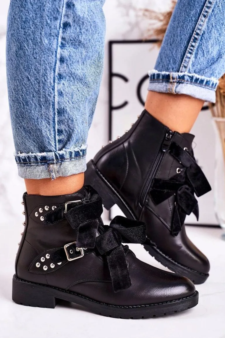 Damskie Ocieplane Botki Z Klamrami I Wstążką Czarne Special