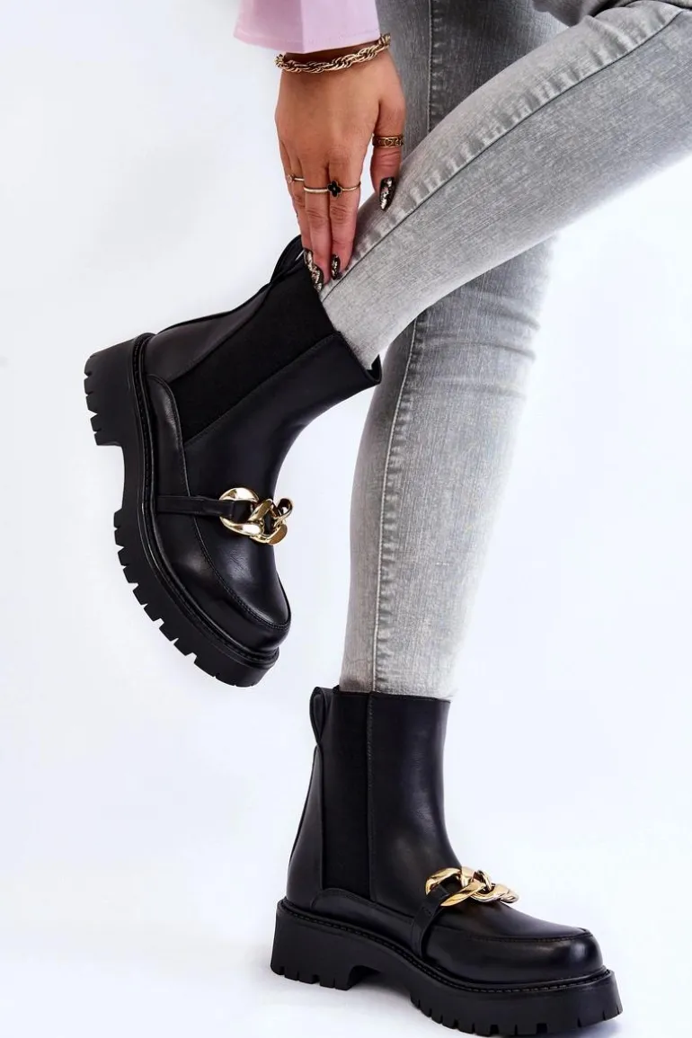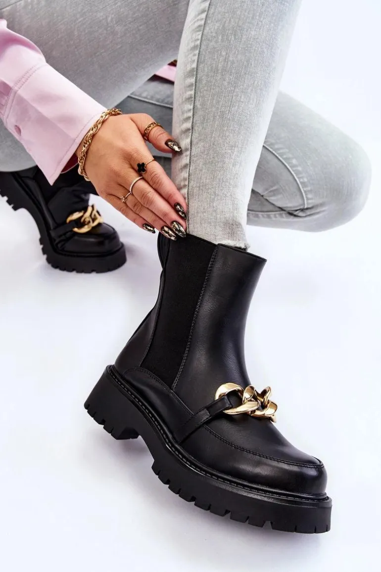 Damskie botki zostały wykonane z połączenia eko skóry oraz elastycznej wstawki. Model klasycznie wsuwany. Sztyblety zostały przyozdobione łańcuchem na przodzie. Botki osadzono na płaskim obcasie ze żłobieniami. Posiadają w środku ocieplenie w postaci delikatnego futerka oraz usztywniany zapiętek. Świetny model do wielu stylizacji! Przy wyborze rozmiaru prosimy sugerować się tabelą rozmiarów.