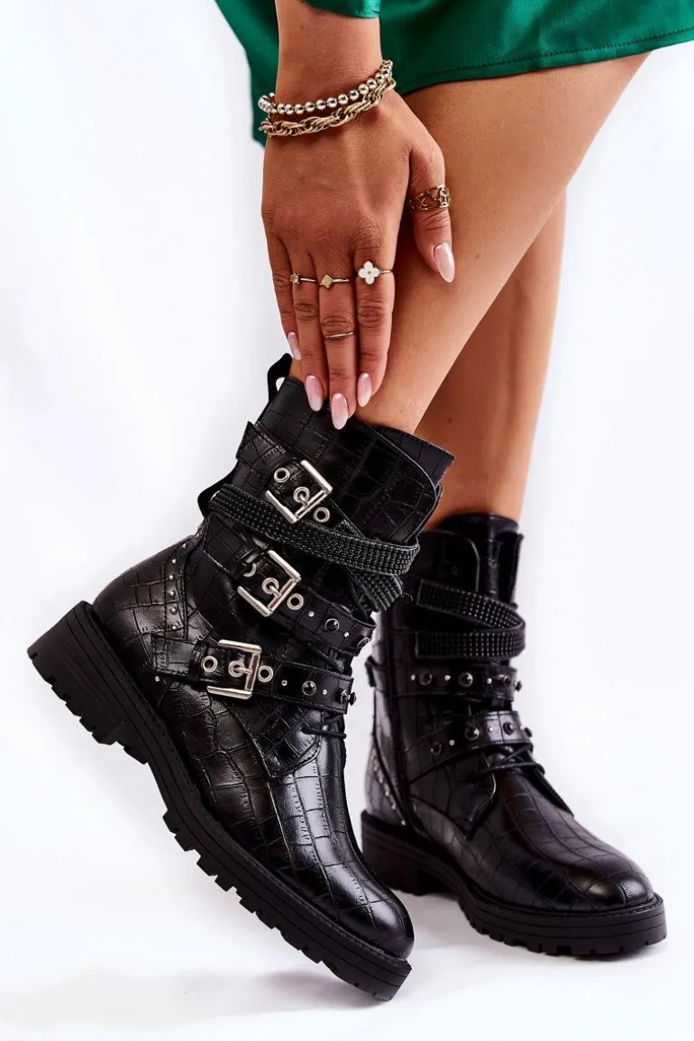 Botki damskie zostały wykonane z eko skóry. Posiadają modne, regulowane paski z ozdobnymi dżetami i koralikami. Osadzone na płaskim obcasie ze żłobieniami. Model ze sznurowaniem oraz suwakiem z boku cholewki. Botki te posiadają ocieplenie w postaci koca obuwniczego. Dodatkowo zapiętek jest usztywniany. Te botki powinny znaleźć się w Twojej szafie! Przy wyborze rozmiaru prosimy sugerować się tabelą rozmiarów.