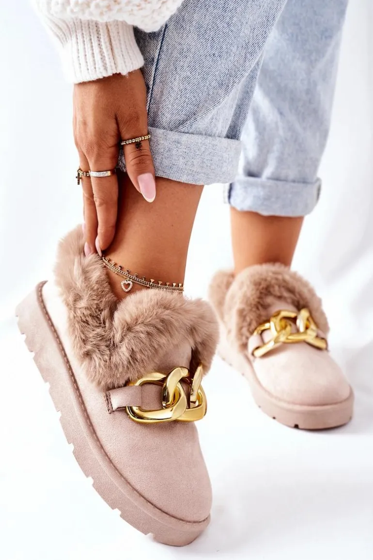 Tym razem coś dla domatorów, śledzących aktualne trendy mody i ceniących sobie komfort. Te wspaniałe papcie koniecznie muszą zagościć w Twojej kolekcji. Dzięki zdobieniu złotym łańcuchem wyglądają wprost cudownie. Klapki wykonane z miłego w dotyku syntetycznego futerka. Przy wyborze rozmiaru prosimy sugerować się tabelą rozmiarów.