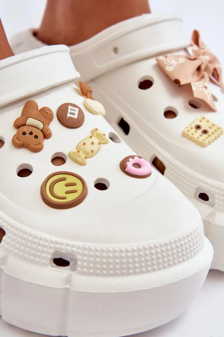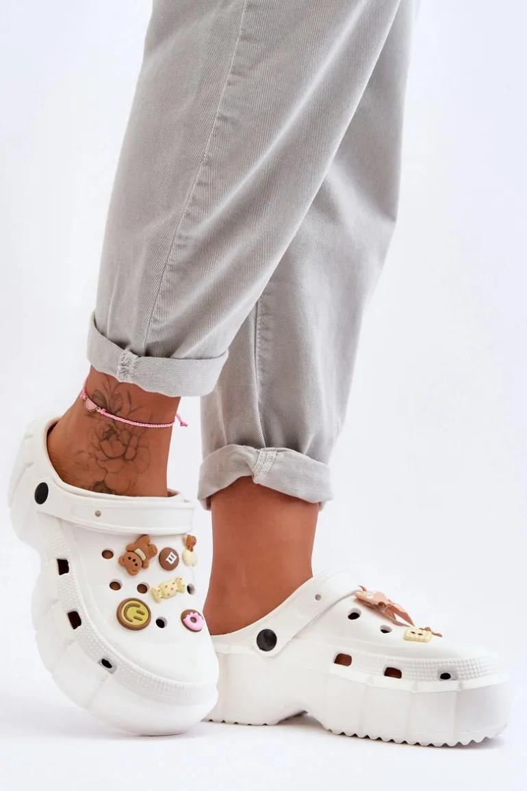 Damskie kroksy z uroczymi elementami zdobiącymi cholewkę powinny być Twoje! Zostały wykonane z lekkiego, piankowego tworzywa. Wkładka posiada delikatne wypustki. Ruchomy paseczek zabezpiecza przed przesuwaniem się stopy. Buty zostały osadzone na masywnym, płaskim obcasie oraz platformie. Otwory w cholewce pozwalają na odpowiednią wentylację obuwia. Przy wyborze rozmiaru prosimy sugerować się tabelą rozmiarów.
