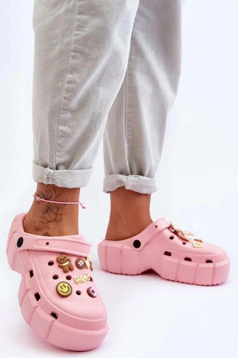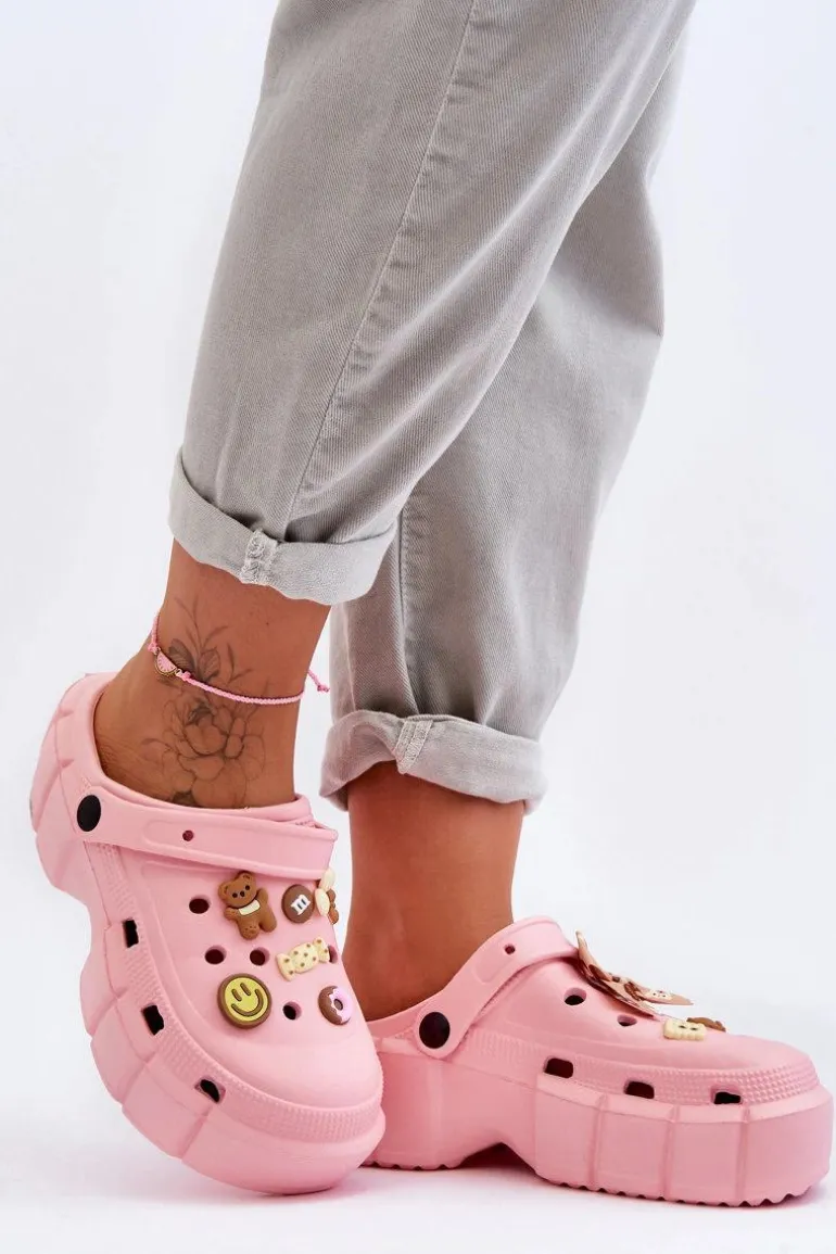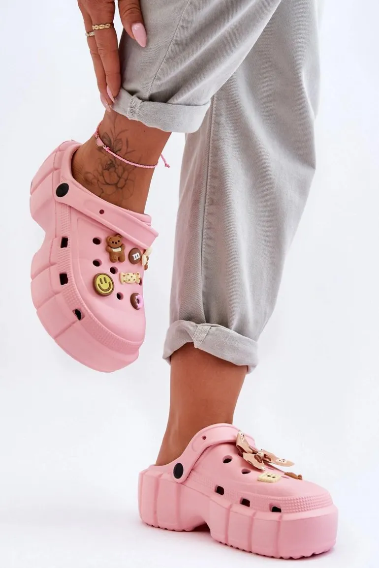 Damskie kroksy z uroczymi elementami zdobiącymi cholewkę powinny być Twoje! Zostały wykonane z lekkiego, piankowego tworzywa. Wkładka posiada delikatne wypustki. Ruchomy paseczek zabezpiecza przed przesuwaniem się stopy. Buty zostały osadzone na masywnym, płaskim obcasie oraz platformie. Otwory w cholewce pozwalają na odpowiednią wentylację obuwia. Przy wyborze rozmiaru prosimy sugerować się tabelą rozmiarów.