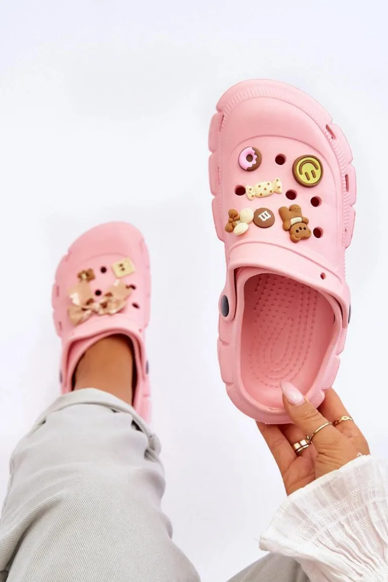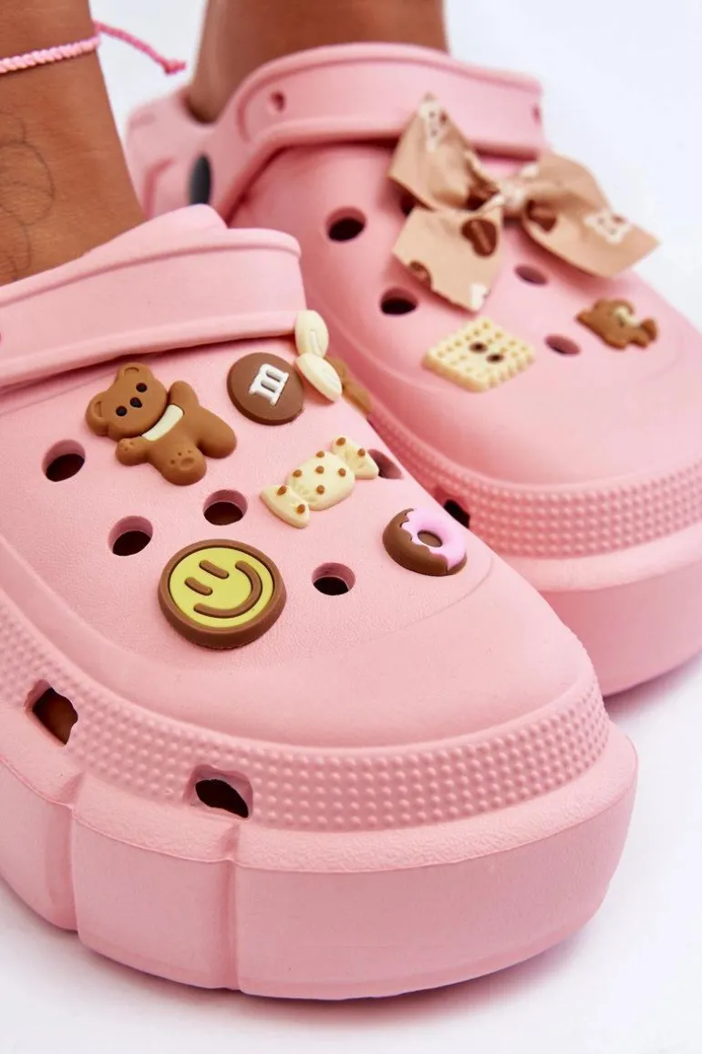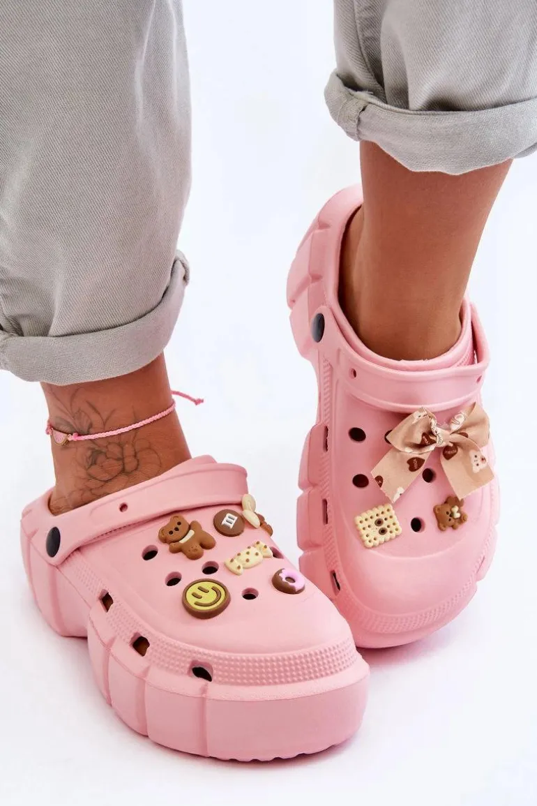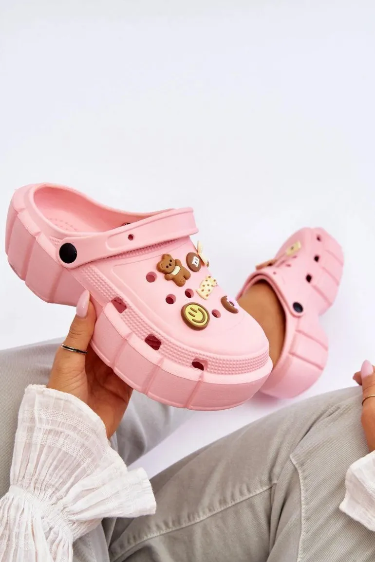 Damskie kroksy z uroczymi elementami zdobiącymi cholewkę powinny być Twoje! Zostały wykonane z lekkiego, piankowego tworzywa. Wkładka posiada delikatne wypustki. Ruchomy paseczek zabezpiecza przed przesuwaniem się stopy. Buty zostały osadzone na masywnym, płaskim obcasie oraz platformie. Otwory w cholewce pozwalają na odpowiednią wentylację obuwia. Przy wyborze rozmiaru prosimy sugerować się tabelą rozmiarów.