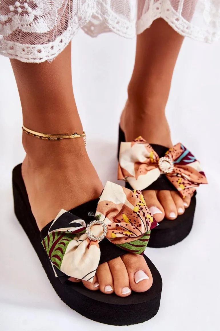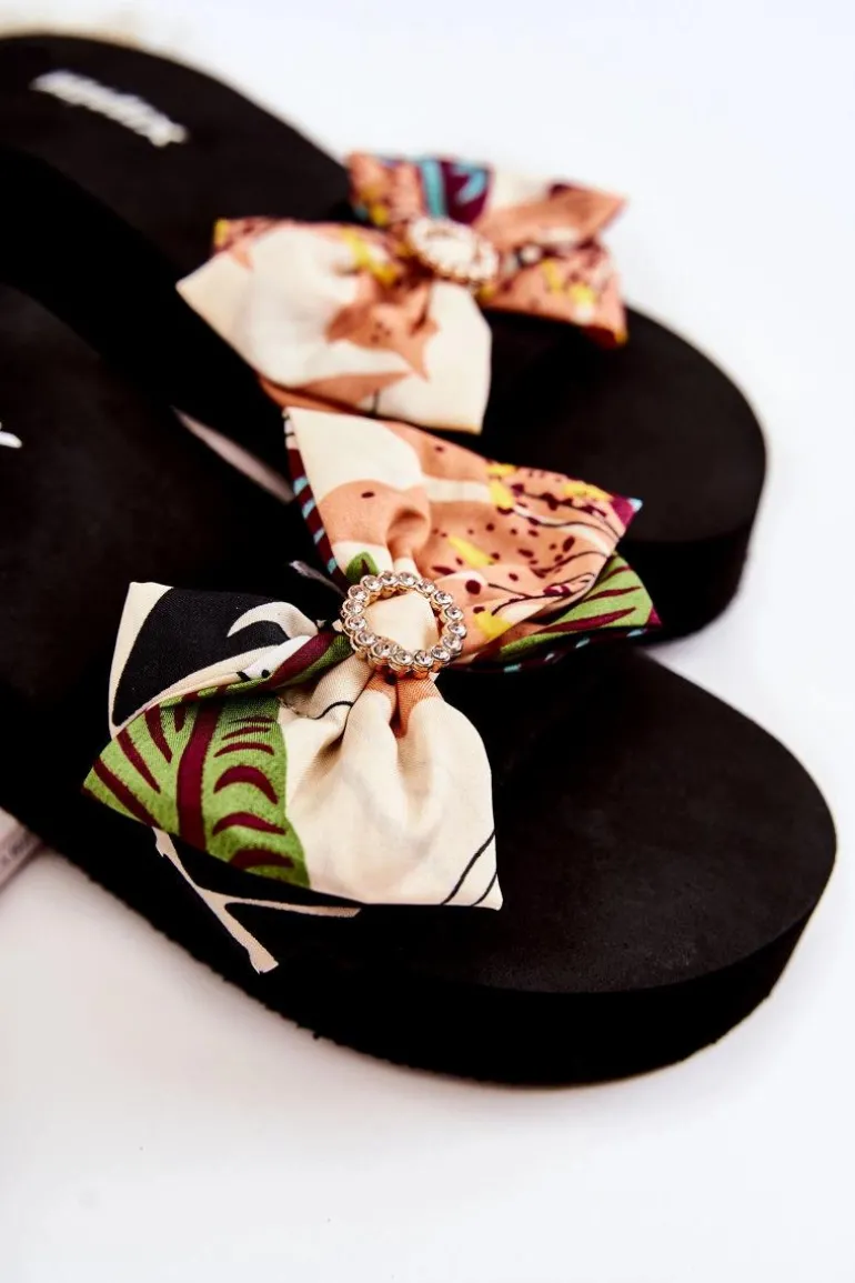 Klasyczne klapki damskie osadzone na koturnie oraz platformie. Pasek wraz z kokardą wykonane z materiału tekstylnego. Podeszwa wraz z koturnem zostały wykonane z piankowego tworzywa. Fason, który na pewno spodoba się niejednej miłośniczce modowych inspiracji! Kokarda została przyozdobiona elementem z tworzywa sztucznego z dżetami imitującymi cyrkonie. Przy wyborze rozmiaru prosimy sugerować się tabelą rozmiarów.