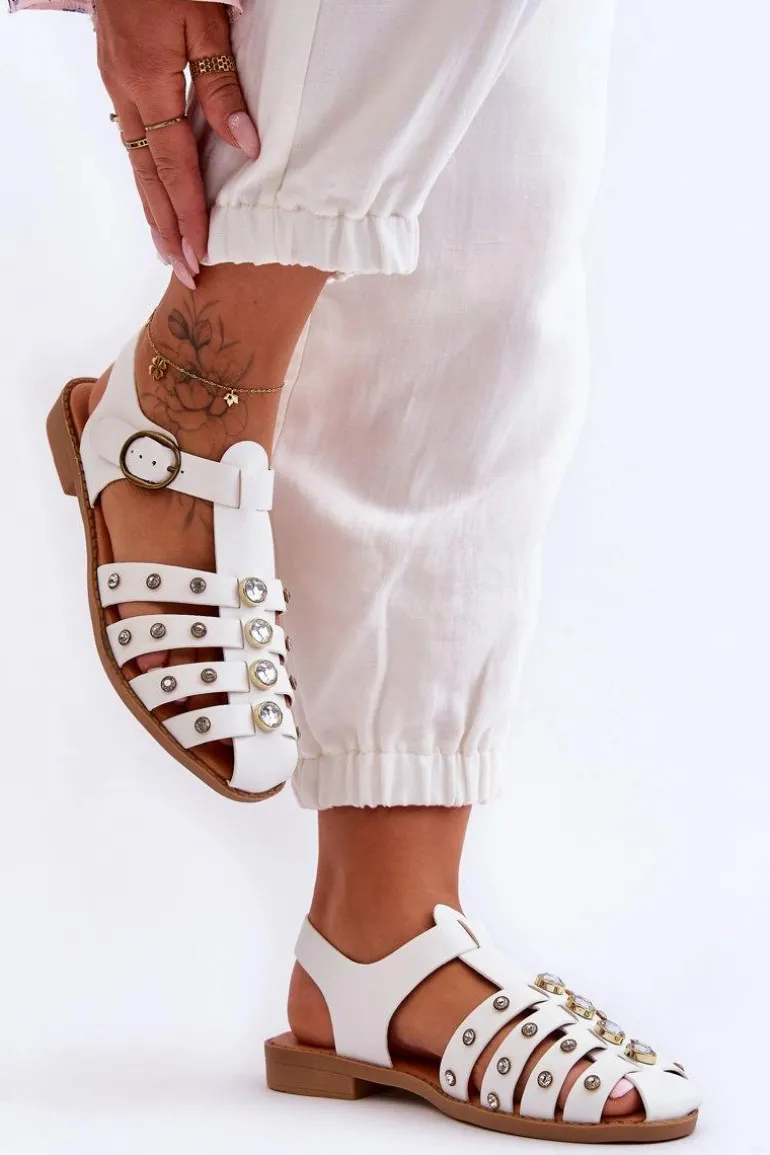 Sandały damskie zostały wykonane z eko skóry. Model ten posiada ozdobne dżety na całości cholewki imitujące cyrkonie. Klasycznie zapinane na regulowany pasek ze sprzączką. Wkładka jest miękka i wygodna podczas użytkowania. Ten niezwykle przewiewny model idealnie sprawdzi się na letnie, upalne dni! Sandałki osadzono na płaskim obcasie z antypoślizgową podeszwą. Przy wyborze rozmiaru prosimy sugerować się tabelą rozmiarów.