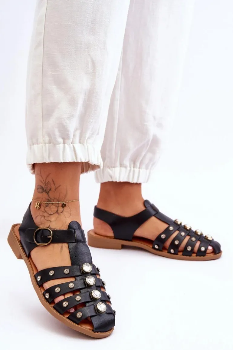 Sandały damskie zostały wykonane z eko skóry. Model ten posiada ozdobne dżety na całości cholewki imitujące cyrkonie. Klasycznie zapinane na regulowany pasek ze sprzączką. Wkładka jest miękka i wygodna podczas użytkowania. Ten niezwykle przewiewny model idealnie sprawdzi się na letnie, upalne dni! Sandałki osadzono na płaskim obcasie z antypoślizgową podeszwą. Przy wyborze rozmiaru prosimy sugerować się tabelą rozmiarów.