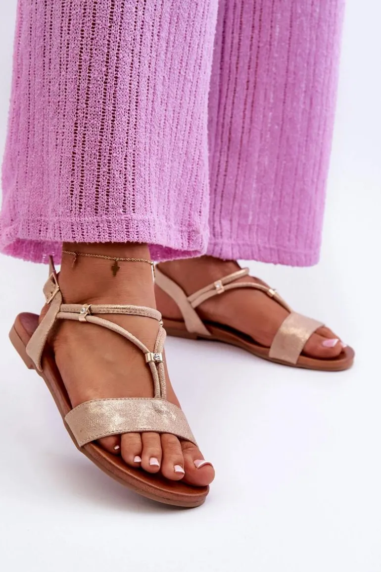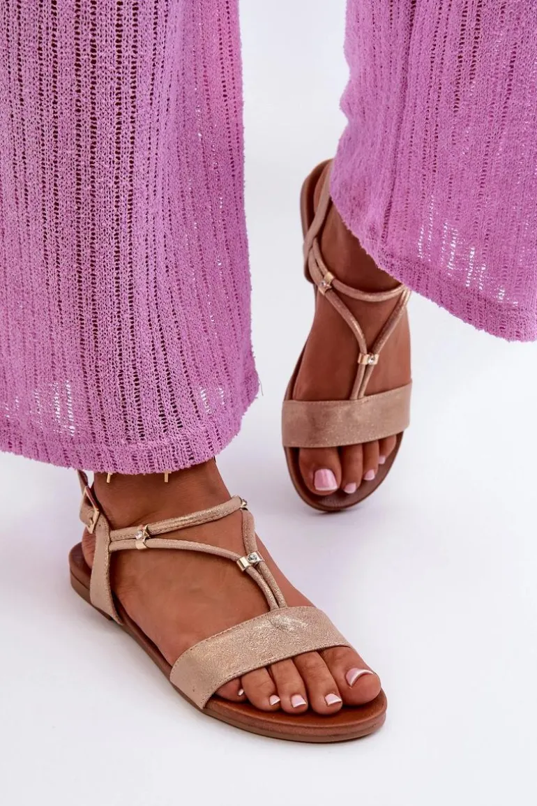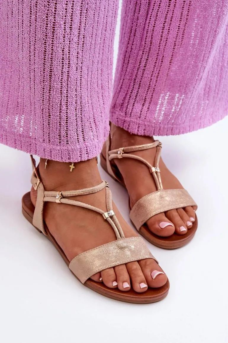 Płaskie sandały damskie wykonane z wysokiej jakości eko skóry. Zapięcie na regulowany pasek ze sprzączką zapewnia idealne dopasowanie i wygodę noszenia. Idealne na ciepłe dni, łączą styl z funkcjonalnością, doskonale sprawdzając się zarówno na codzienne spacery, jak i na bardziej eleganckie okazje. Przy wyborze rozmiaru prosimy kierować się tabelą rozmiarów.