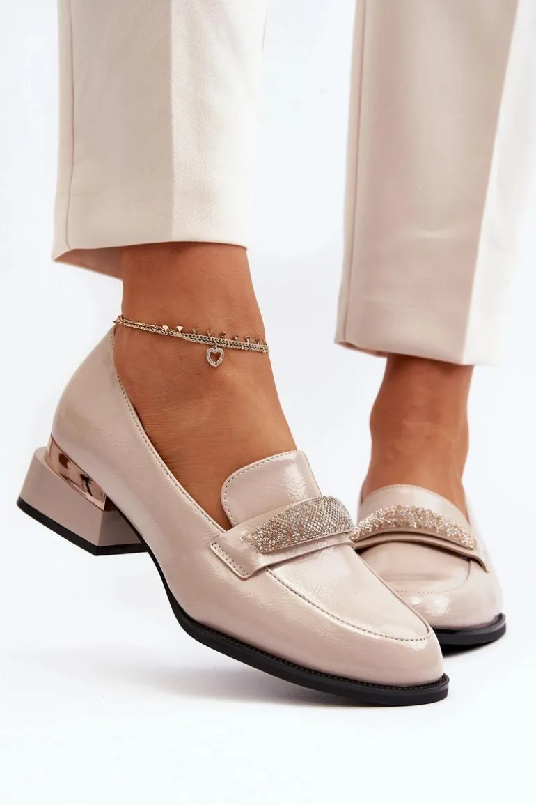 Eleganckie półbuty damskie osadzone na niskim obcasie z lustrzanym elementem. Wykonane z eko skóry. Noski zaokrąglone. Na przodzie ozdobny paseczek. Wkładka ze skóry naturalnej zapewni wygodę użytkowania. Idealne do wielu wiosennych stylizacji! Przy wyborze rozmiaru prosimy sugerować się tabelą rozmiarów.