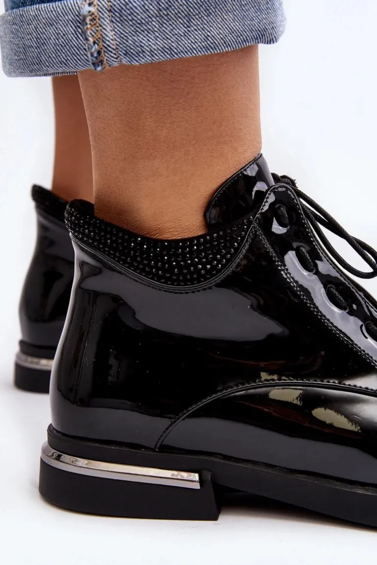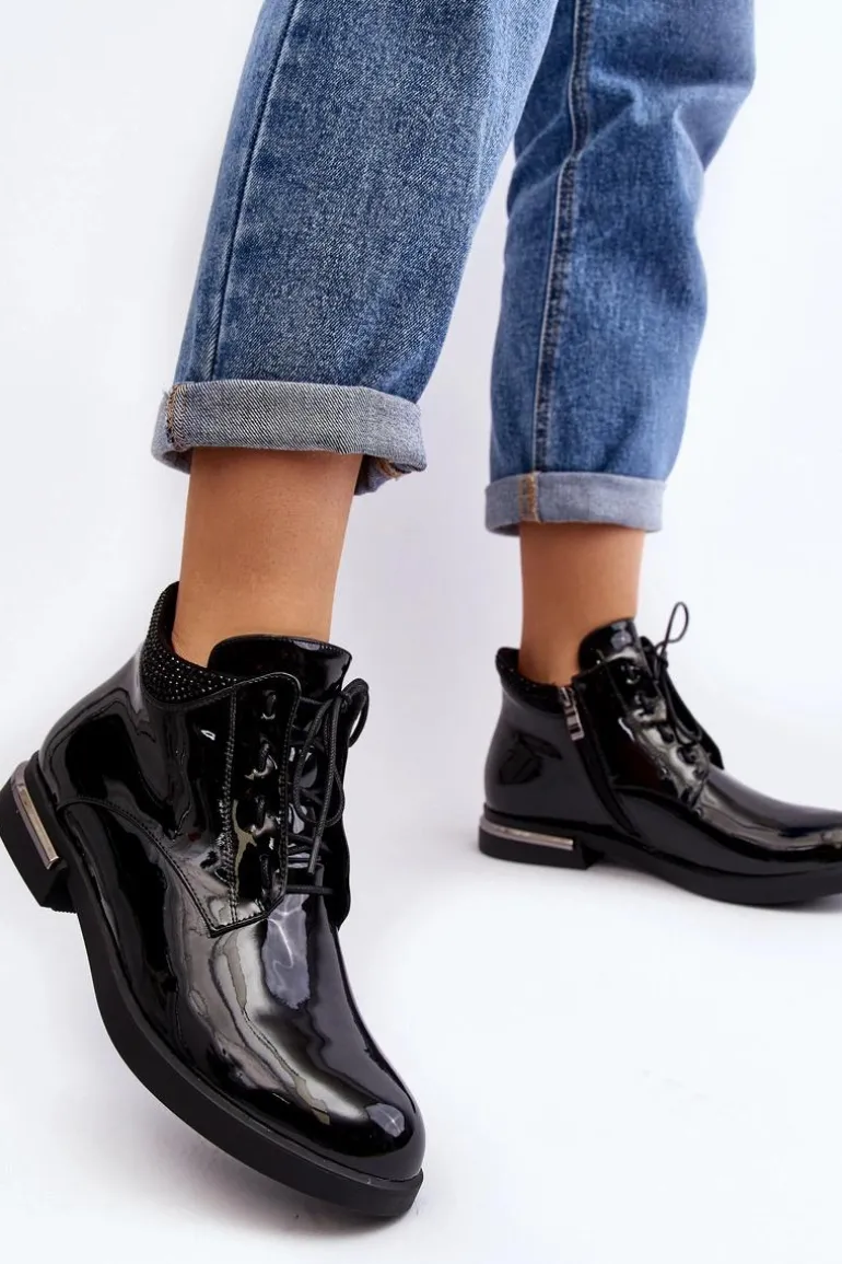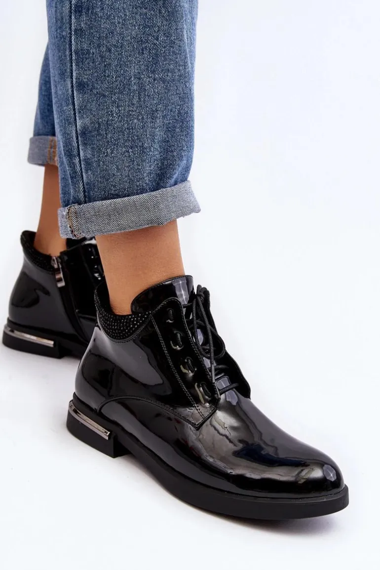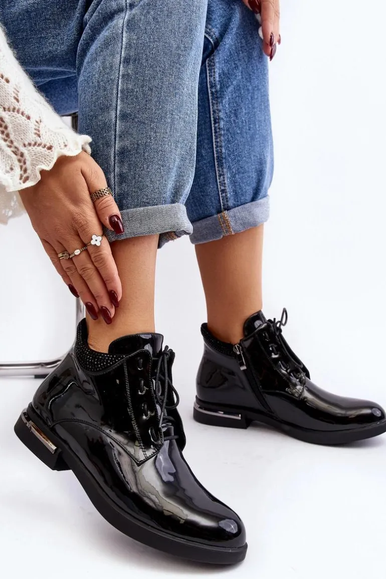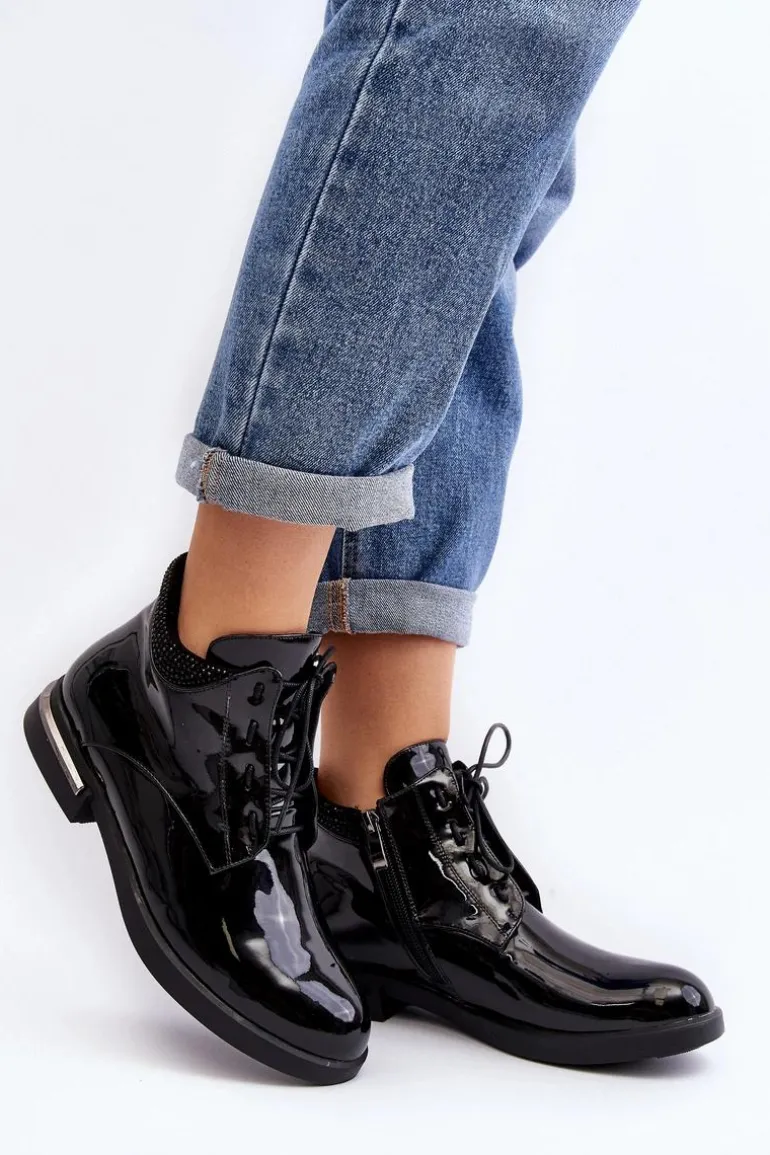 Półbuty damskie zostały wykonane z eko skóry. Osadzone są na płaskim obcasie z lustrzanym elementem, który dodaje im subtelnego blasku. Nosek butów jest zaokrąglony. Ten elegancki model świetnie sprawdzi się w wielu stylizacjach! Koniecznie powinnaś mieć go w swojej szafie! Podczas wyboru rozmiaru prosimy sugerować się tabelą rozmiarów.