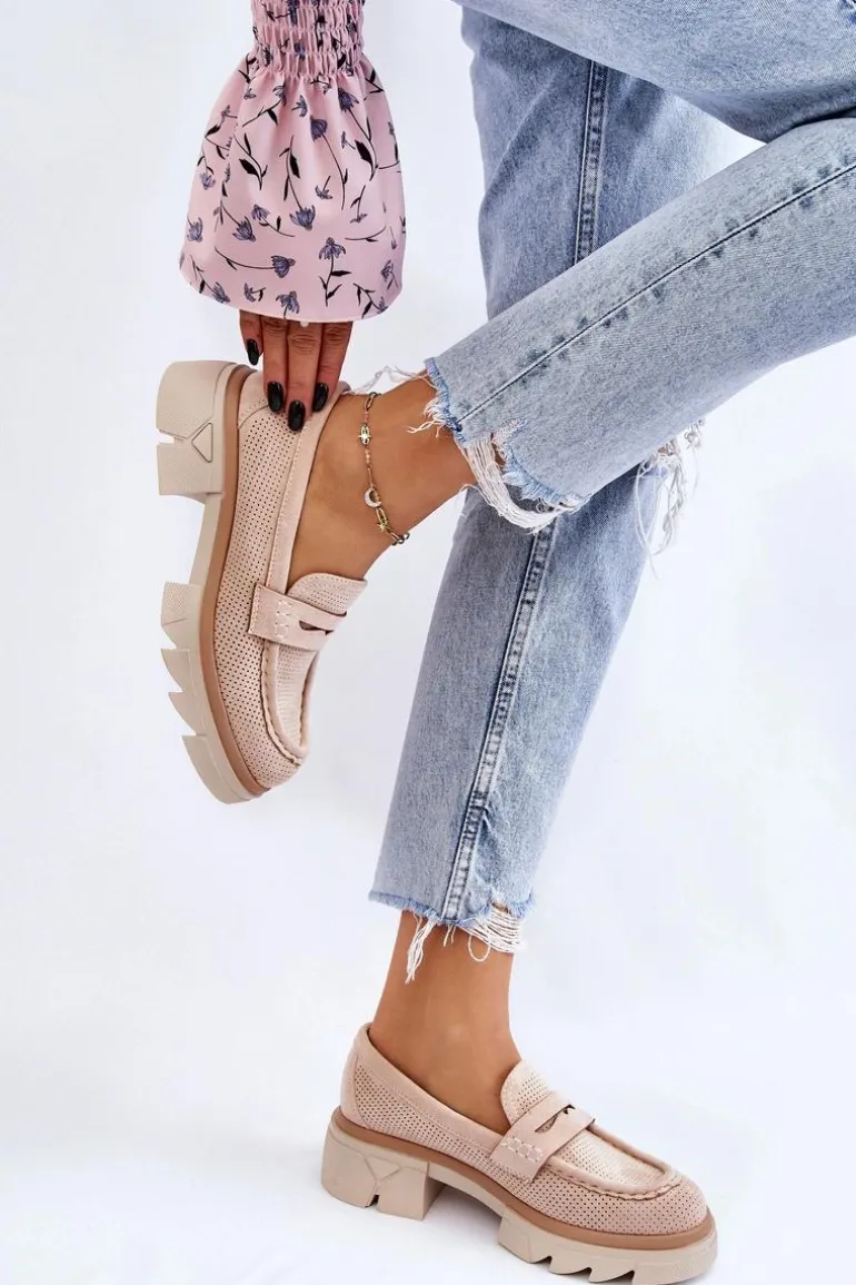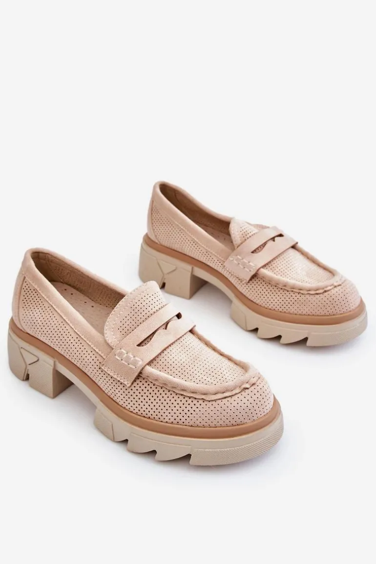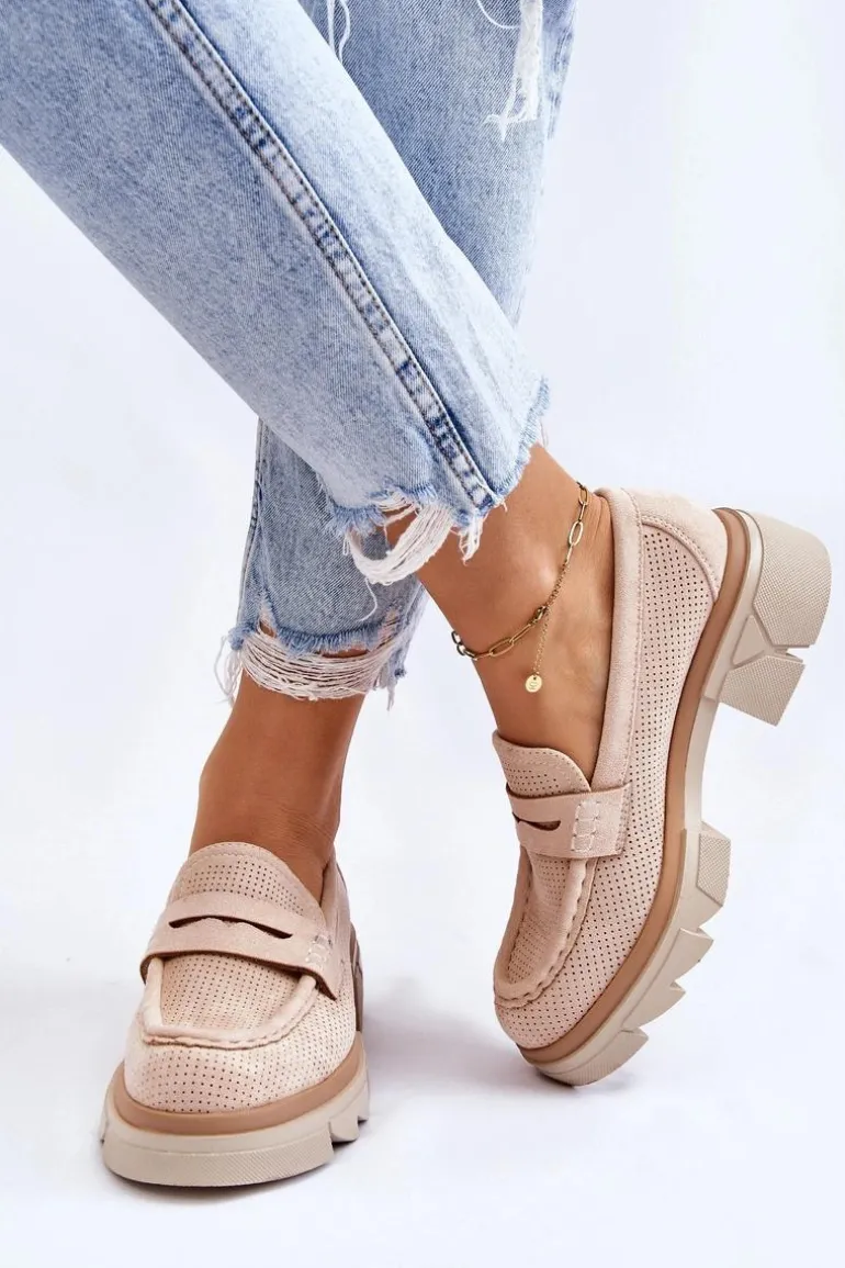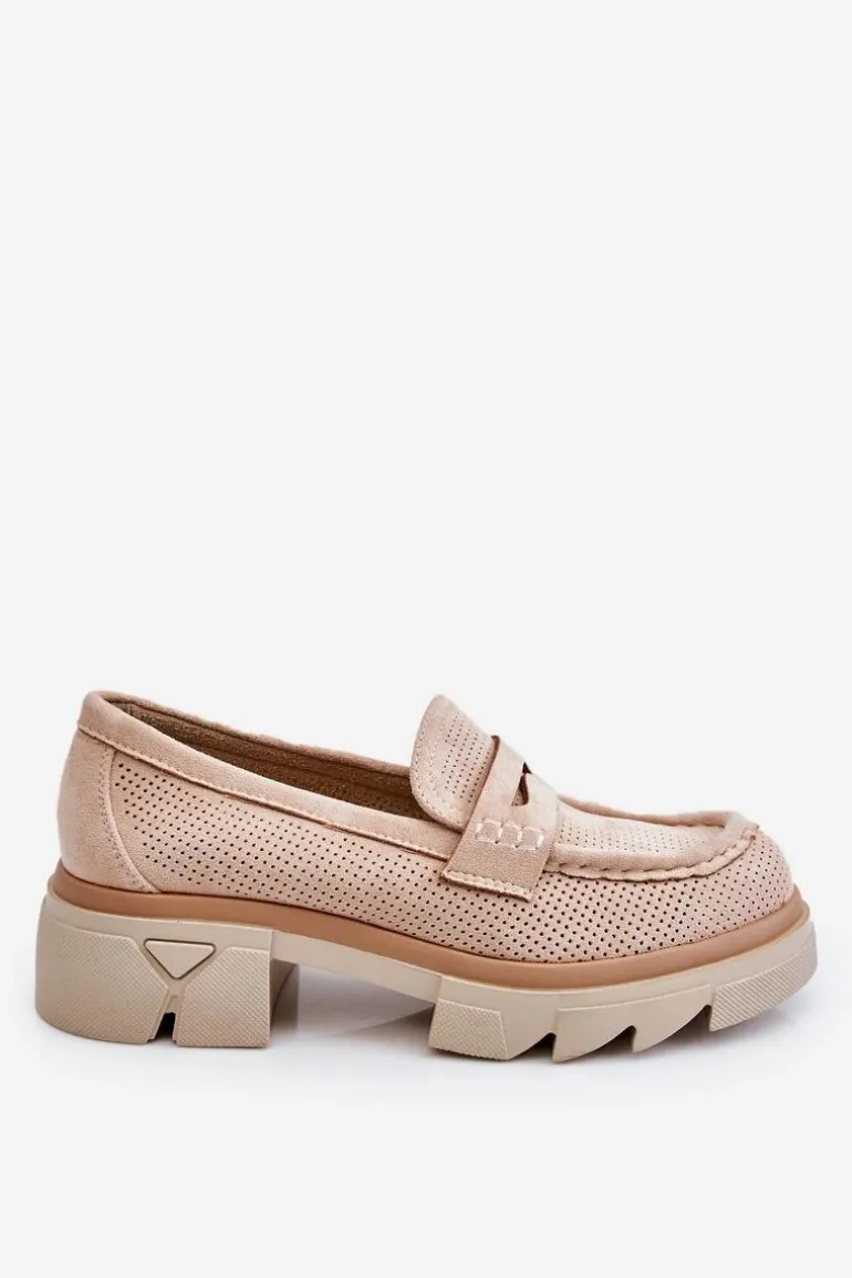 Damskie półbuty w stylu mokasynów zostały osadzone na masywnym, płaskim obcasie i platformie. Wykonane z materiału przypominającego eko zamsz. Miękka wkładka z naturalnej skóry zapewni wygodę podczas użytkowania. Cholewka w ażurowy wzór. Zapiętek został usztywniony. Świetny model do wielu stylizacji! Przy wyborze rozmiaru prosimy sugerować się tabelą rozmiarów.