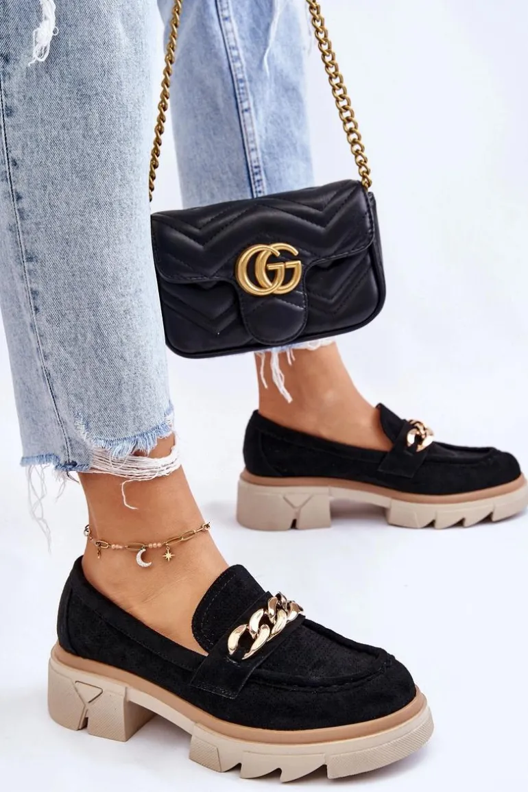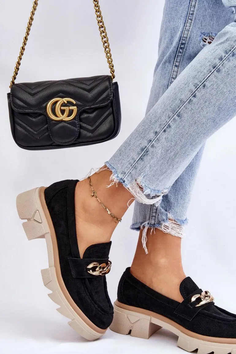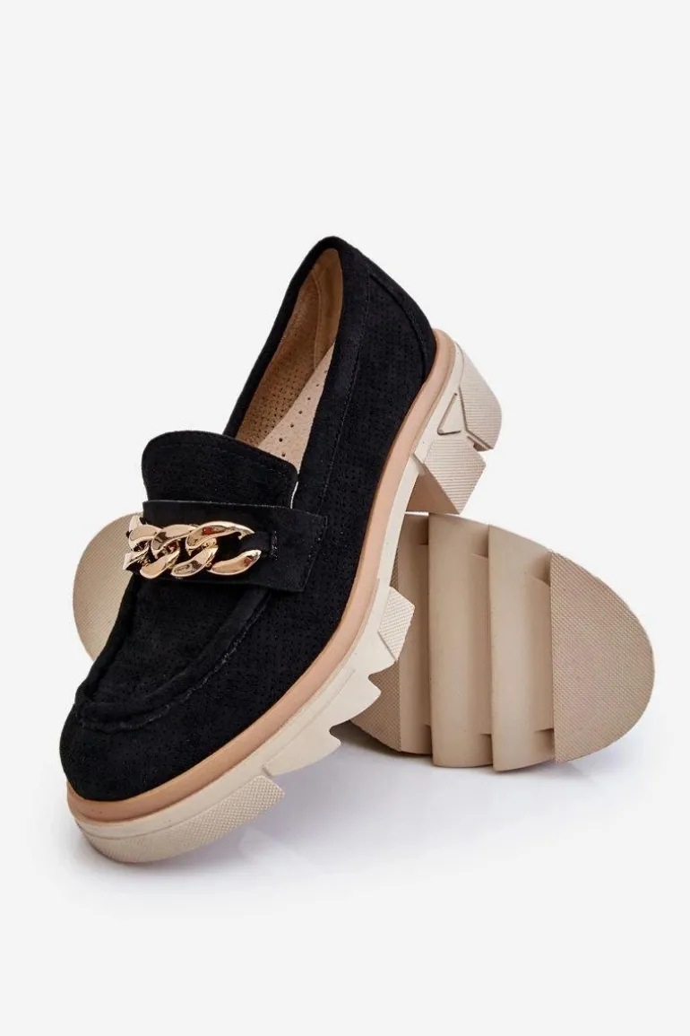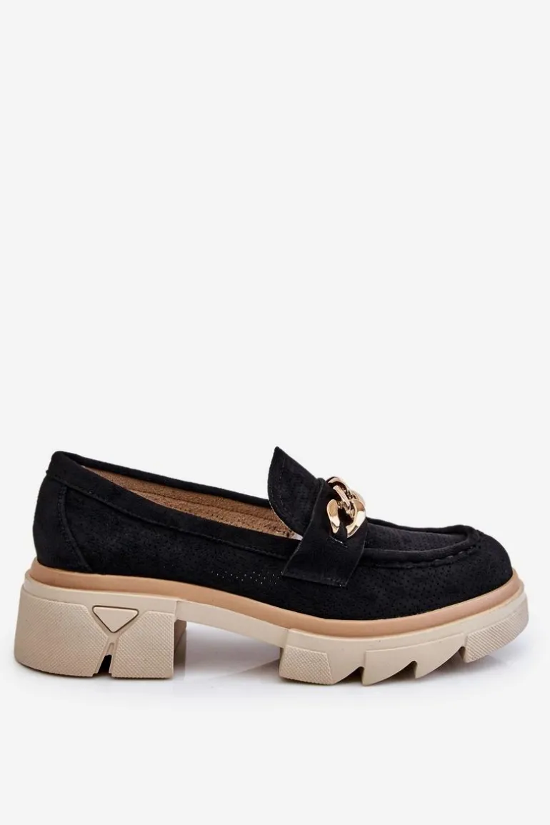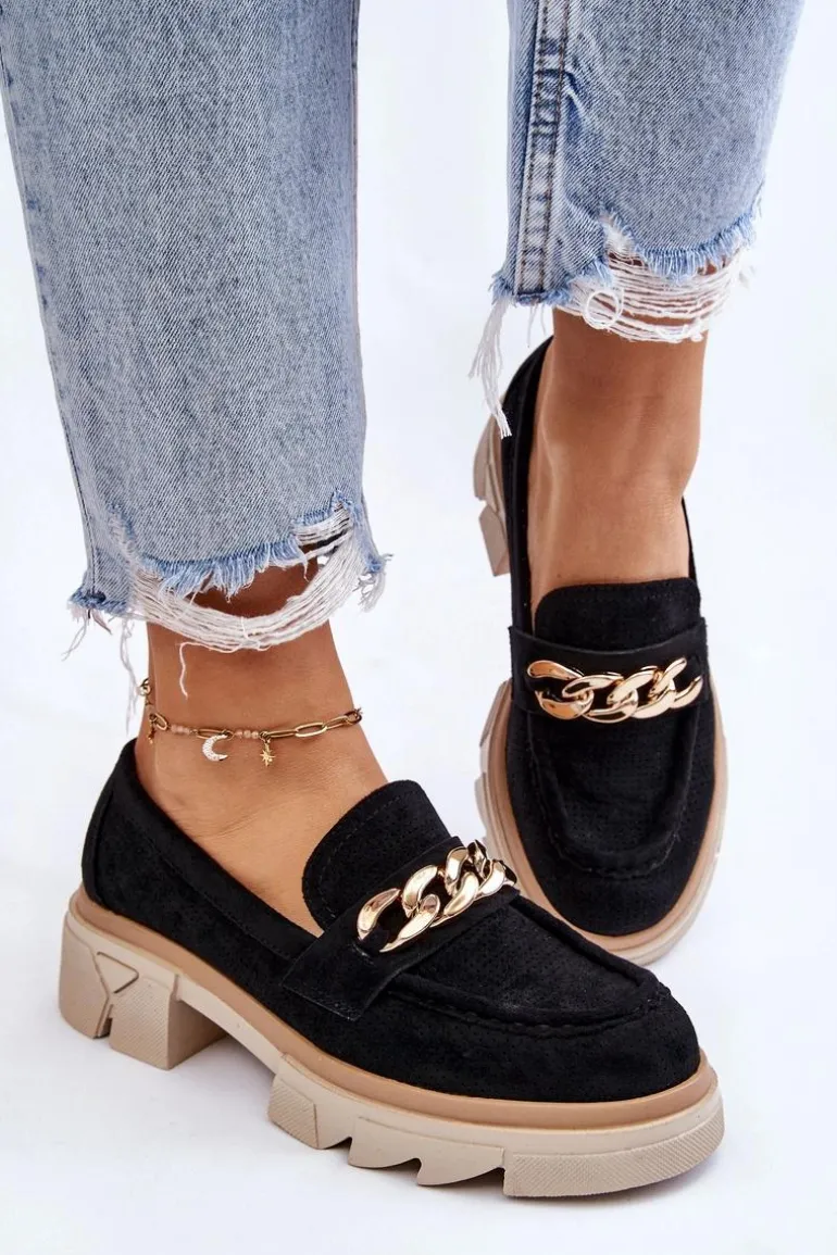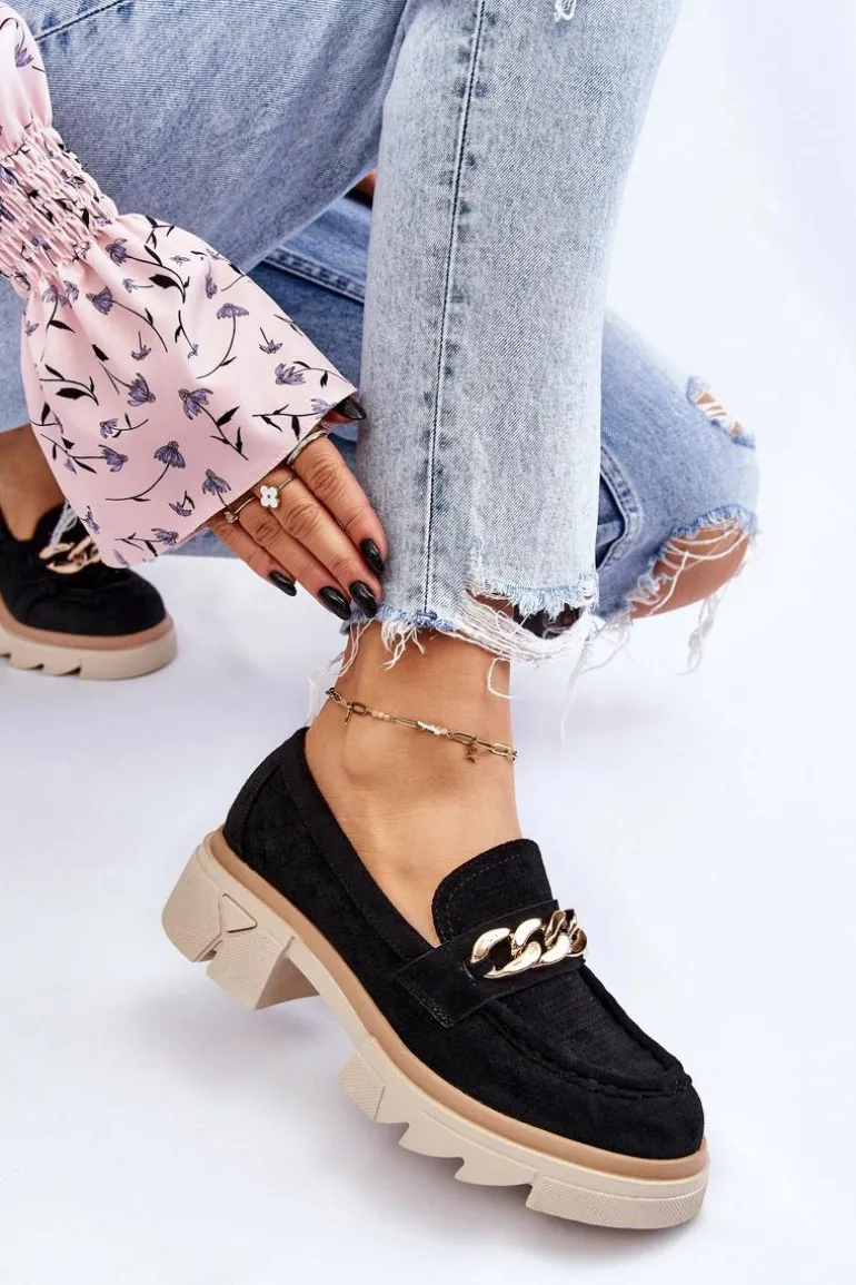 Damskie półbuty w stylu mokasynów zostały osadzone na masywnym, płaskim obcasie i platformie. Ozdobione eleganckim łańcuchem z przodu buta. Wykonane z materiału przypominającego eko zamsz. Miękka wkładka z naturalnej skóry zapewni wygodę podczas użytkowania. Cholewka w ażurowy wzór. Idealny model do wielu stylizacji! Przy wyborze rozmiaru prosimy sugerować się tabelą rozmiarów.