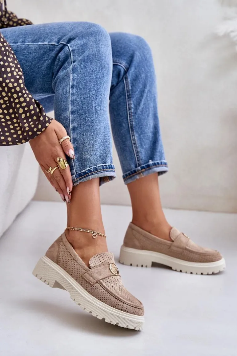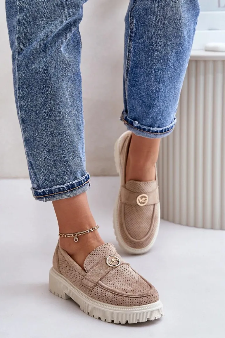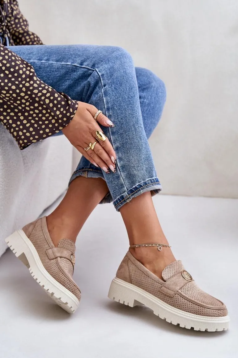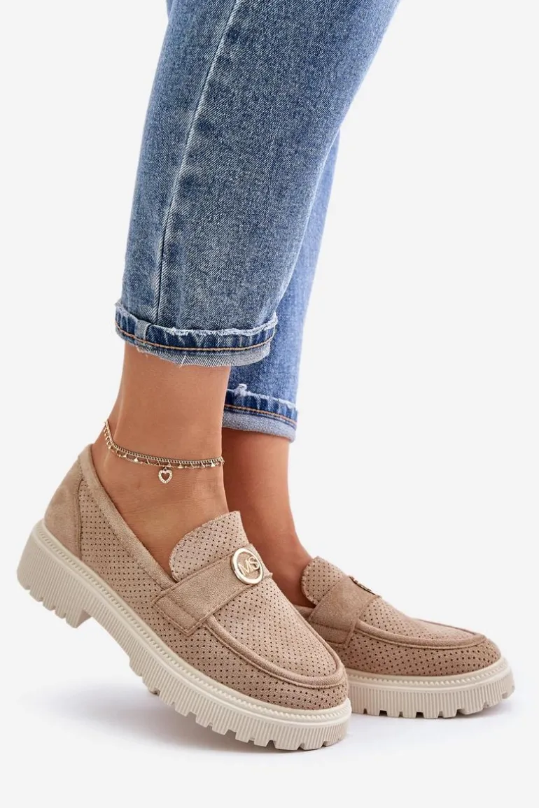 Damskie mokasyny wykonane z eko zamszu. Osadzone na platformie i płaskim obcasie. Noski zaokrąglone. Model ten wyróżnia się złotym, małym detalem, który nadaje elegancji. Modny fason, który idealnie uzupełni stylizacje ze spodniami i sukienkami! Przy wyborze rozmiaru prosimy sugerować się tabelą rozmiarów.