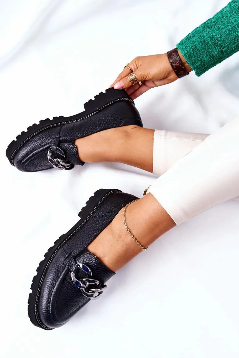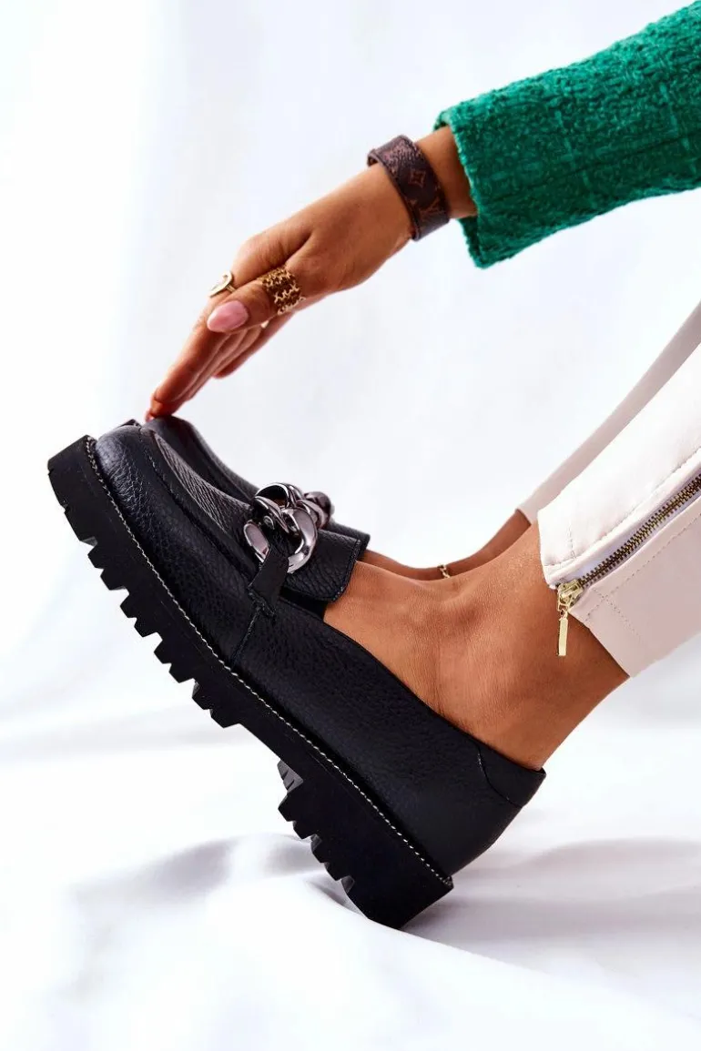 Klasyczne półbuty w stylu przepięknych loaferów! Buty zostały wykonane z wysokiej jakości skóry naturalnej. Charakterystyczne zdobienie w postaci łańcucha sprawi, że stworzymy z nimi wiele wspaniałych stylizacji. Wysoka podeszwa oraz obcas, który uniesie naszą sylwetkę. Przy wyborze rozmiaru prosimy sugerować się tabelą rozmiarów.