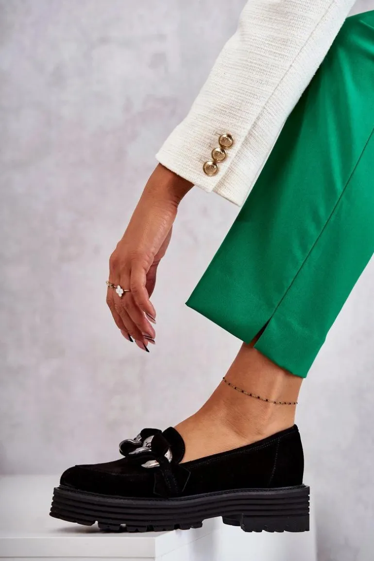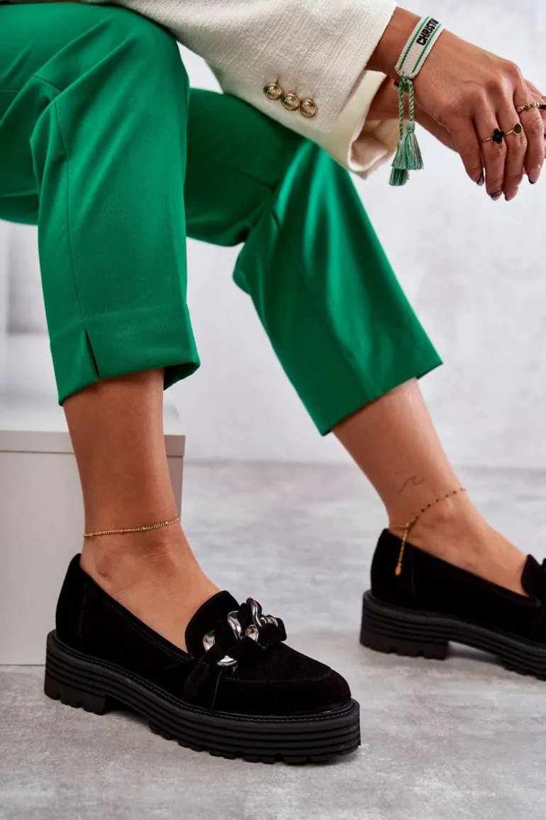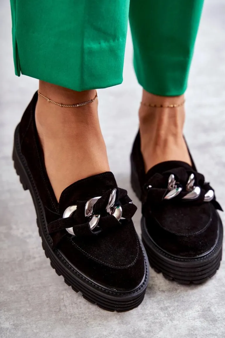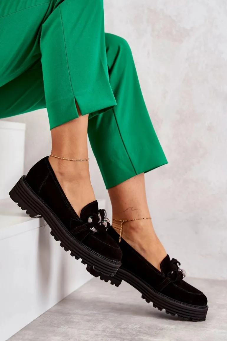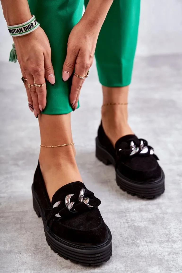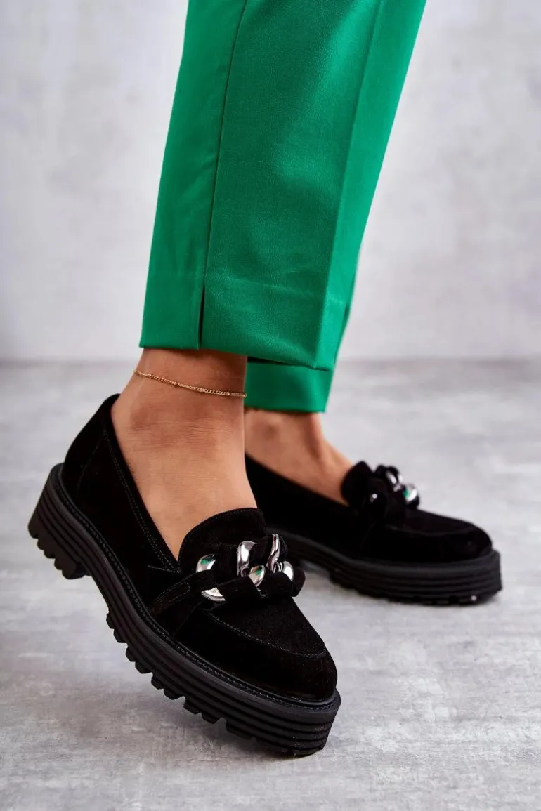 Klasyczne półbuty zostały wykonane z wysokiej jakości zamszowej skóry naturalnej. Na przodzie charakterystyczne zdobienie w postaci łańcucha z przeplatającym się paskiem z naturalnego zamszu. Buty te posiadają platformę oraz płaski obcas. Podeszwa ze żłobieniami świetnie odizoluje od nierównego podłoża. Świetny model do wielu stylizacji! Wygodne, a zarazem modne. Koniecznie musisz je mieć! Przy wyborze rozmiaru prosimy sugerować się tabelą rozmiarów.