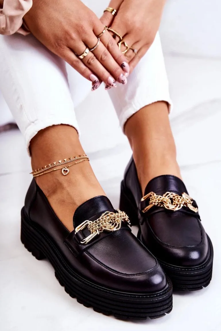 Klasyczne półbuty w stylu przepięknych loaferów! Buty zostały wykonane z wysokiej jakości skóry naturalnej. Charakterystyczne zdobienie w postaci łańcucha sprawi, że stworzymy z nimi wiele wspaniałych stylizacji. Posiadają wysoką podeszwę obszytą nicią oraz płaski obcas, który uniesie sylwetkę. Świetny model do wielu stylizacji! Wygodne, a zarazem modne. Koniecznie musisz je mieć! Przy wyborze rozmiaru prosimy sugerować się tabelą rozmiarów.