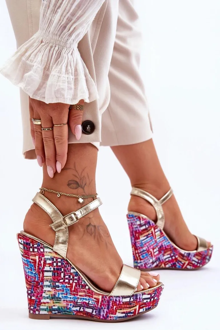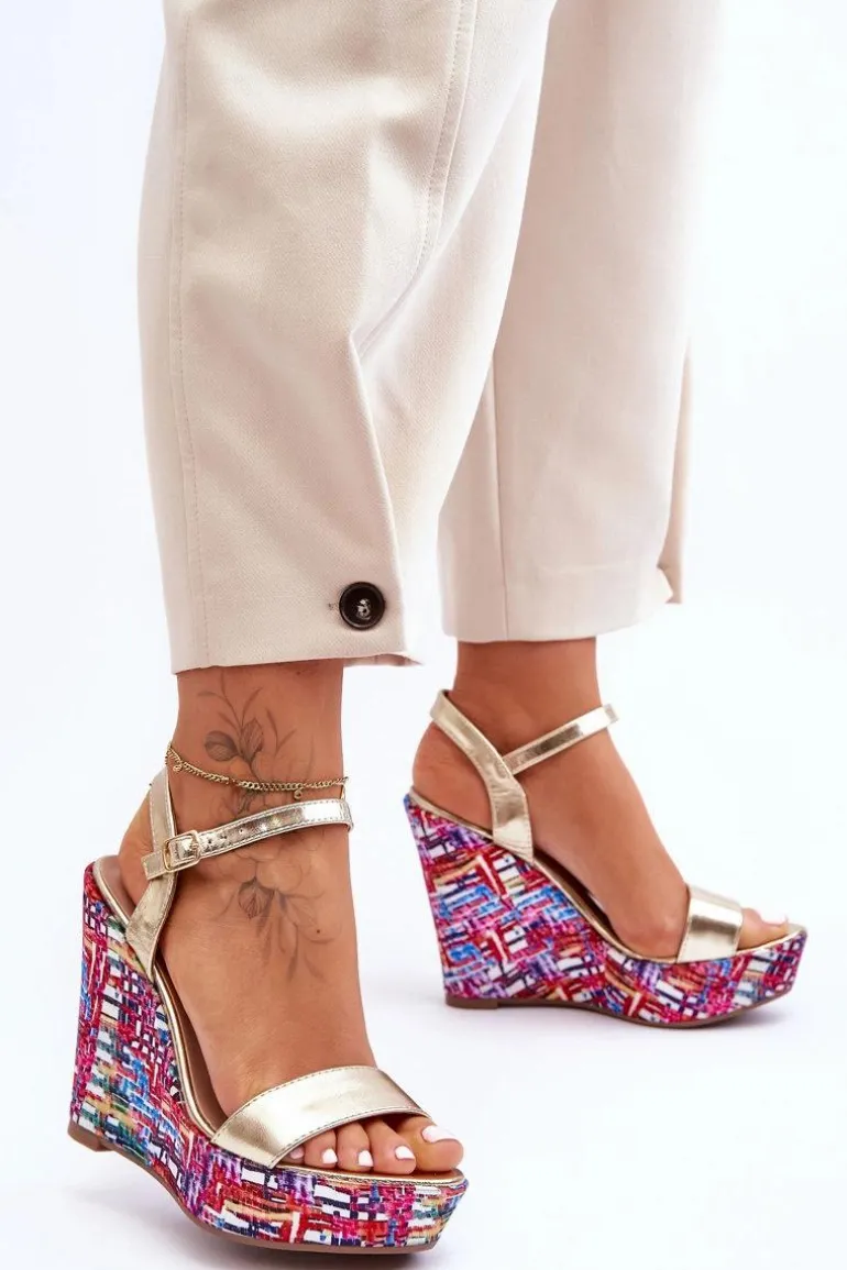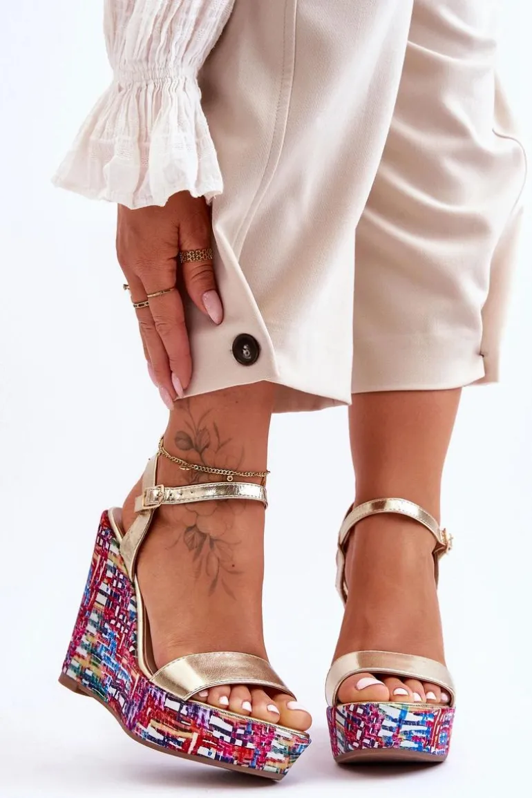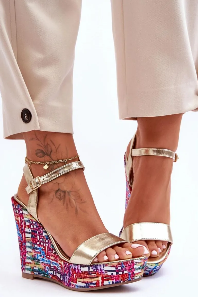 Damskie Sandałki Na Kolorowym Koturnie Złote Malibu