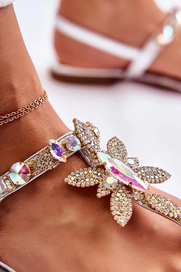 Wyjątkowe sandały damskie o fasonie japonek. Posiadają zdobienia w postaci mieniących się dżetów imitujących cyrkonie i kryształy. Zapinane na sprzączkę z regulowanym paskiem wokół kostki. Miękka wkładka z eko skóry zapewni komfort i wygodę podczas użytkowania. Buty osadzone na płaskim obcasie z antypoślizgową podeszwą. Koniecznie powinnaś je mieć w swojej garderobie! Przy wyborze rozmiarów, prosimy sugerować się tabelą rozmiarów.