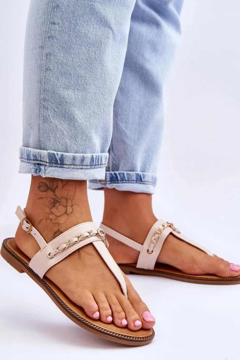 Sandały o fasonie japonek to idealny wybór na cieplejsze dni! Zostały wykonane z eko skóry. Posiadają zdobienie w postaci łańcuszka oraz kłódki. Zapinane wokół kostki na regulowany pasek ze sprzączką. Dodatkowo na podeszwie przy wkładce znajdują się zdobienia. Sandałki osadzono na płaskim obcasie i gumowej podeszwie. Komfortowa w użytkowaniu wkładka została wykonana z eko skóry. Przy wyborze rozmiaru prosimy kierować się tabelą rozmiarów.