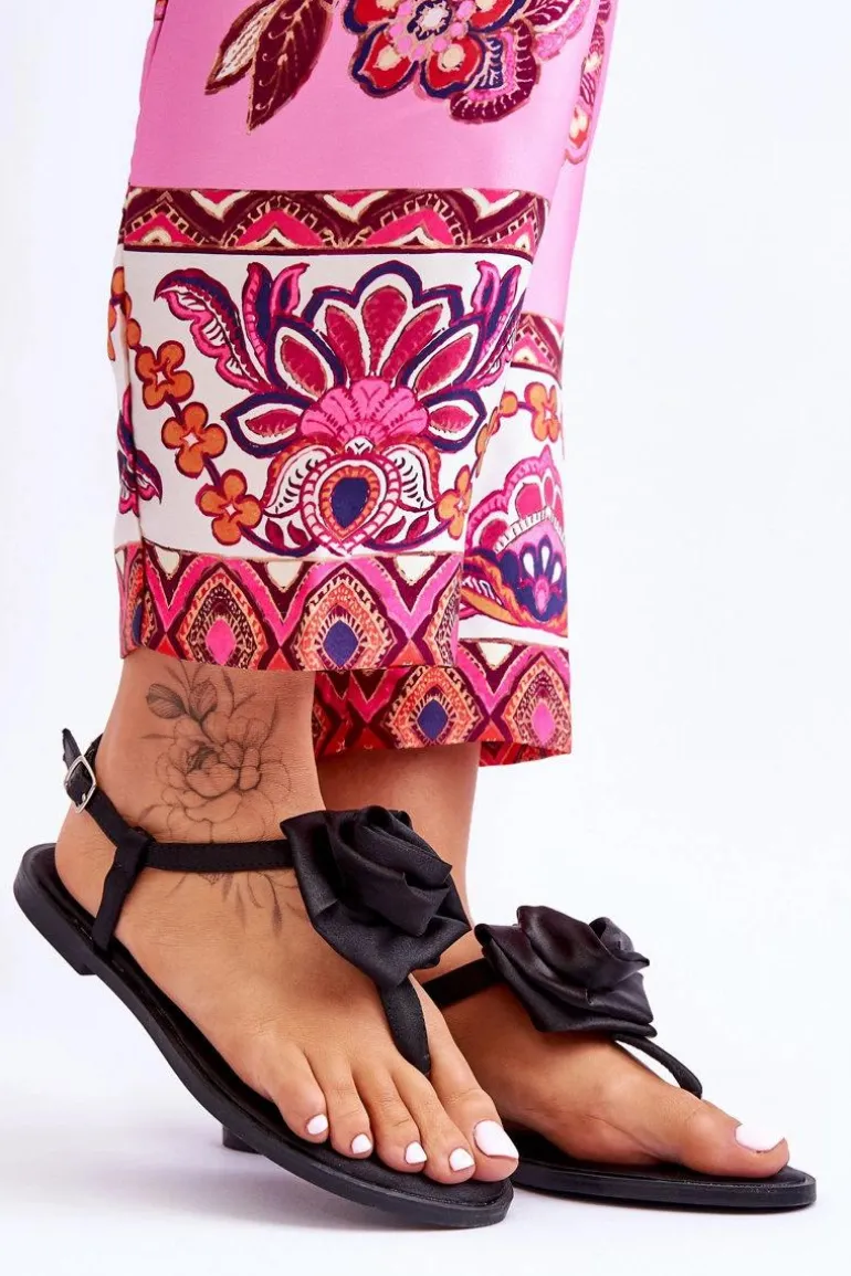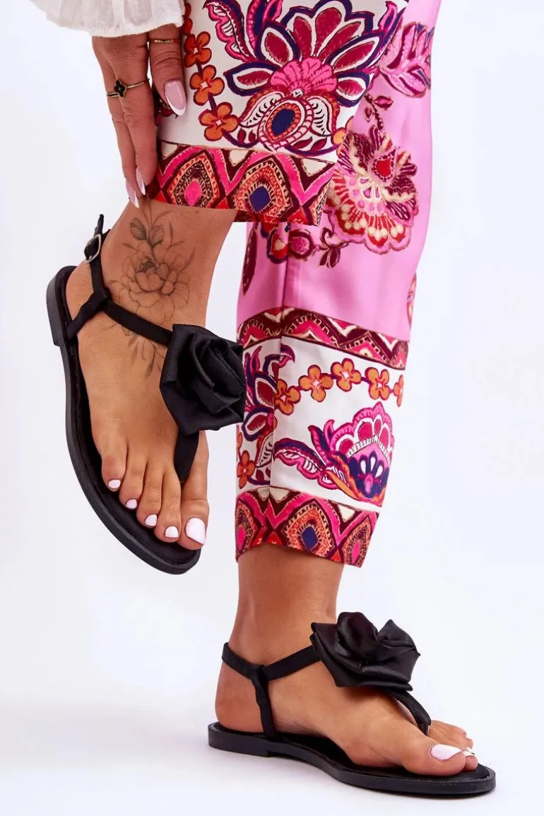 Damskie sandałki zostały wykonane z materiału tekstylnego imitującego satynę. Ozdobione na środku dużą, materiałową różą. Sandałki w stylu japonek osadzono na płaskim obcasie. Zapinane są na regulowany pasek ze sprzączką. Miękka wkładka została wykonana z materiału. Przy wyborze rozmiaru prosimy kierować się tabelą rozmiarów.