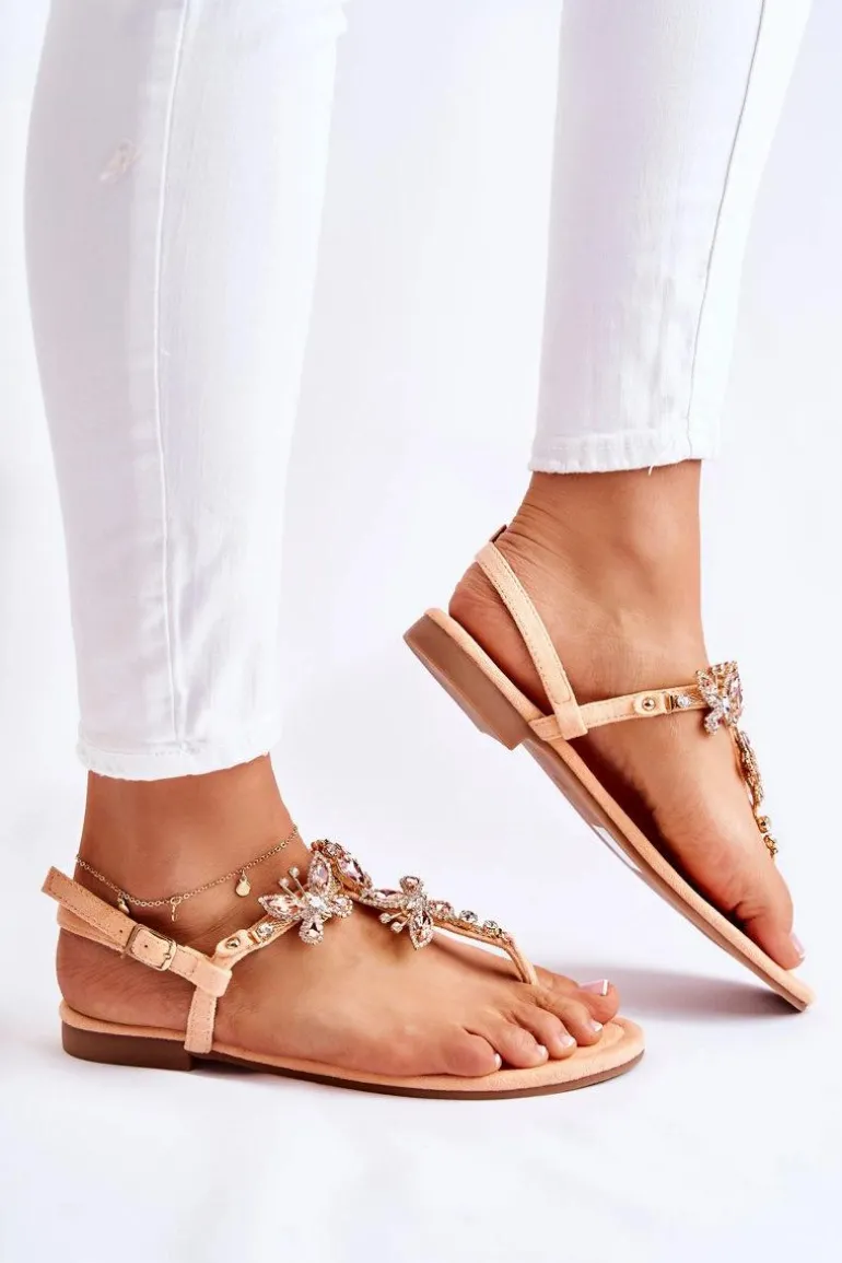 Damskie sandały o fasonie japonek. Posiadają zdobienia w postaci motyli z ozdobnymi dżetami w formie cyrkonii i kryształów. Zapinane na sprzączkę z regulowanym paskiem wokół kostki. Paseczki, jak i wkładka są wykonane z eko zamszu, co zapewni komfort i wygodę podczas użytkowania. Buty osadzone na płaskim obcasie z antypoślizgową podeszwą. Przy wyborze rozmiarów, prosimy sugerować się tabelą rozmiarów.