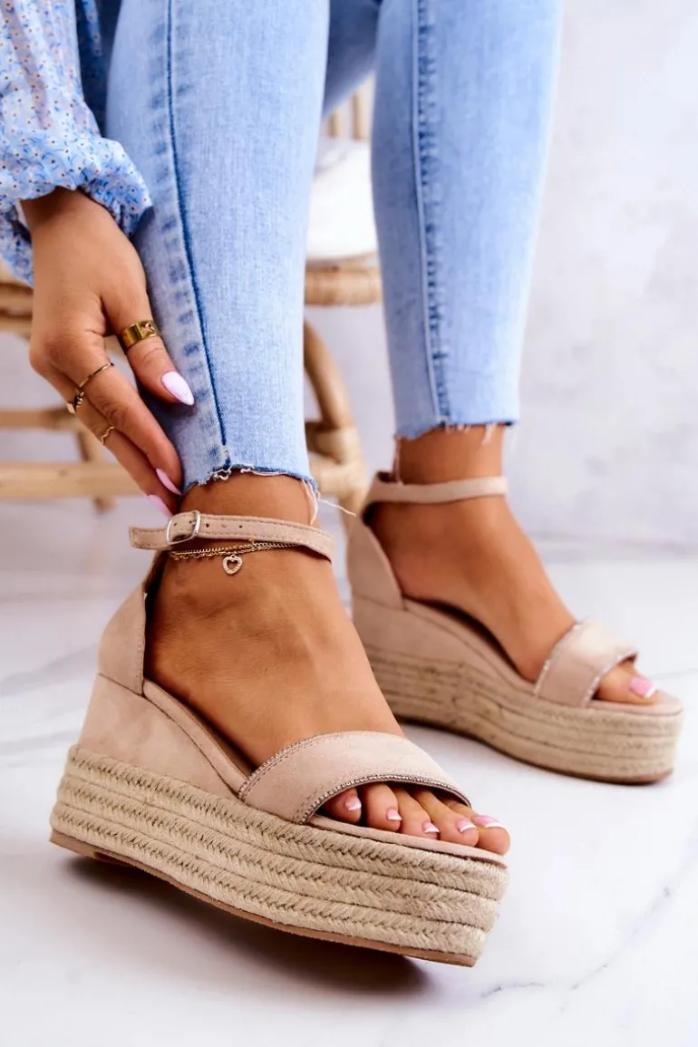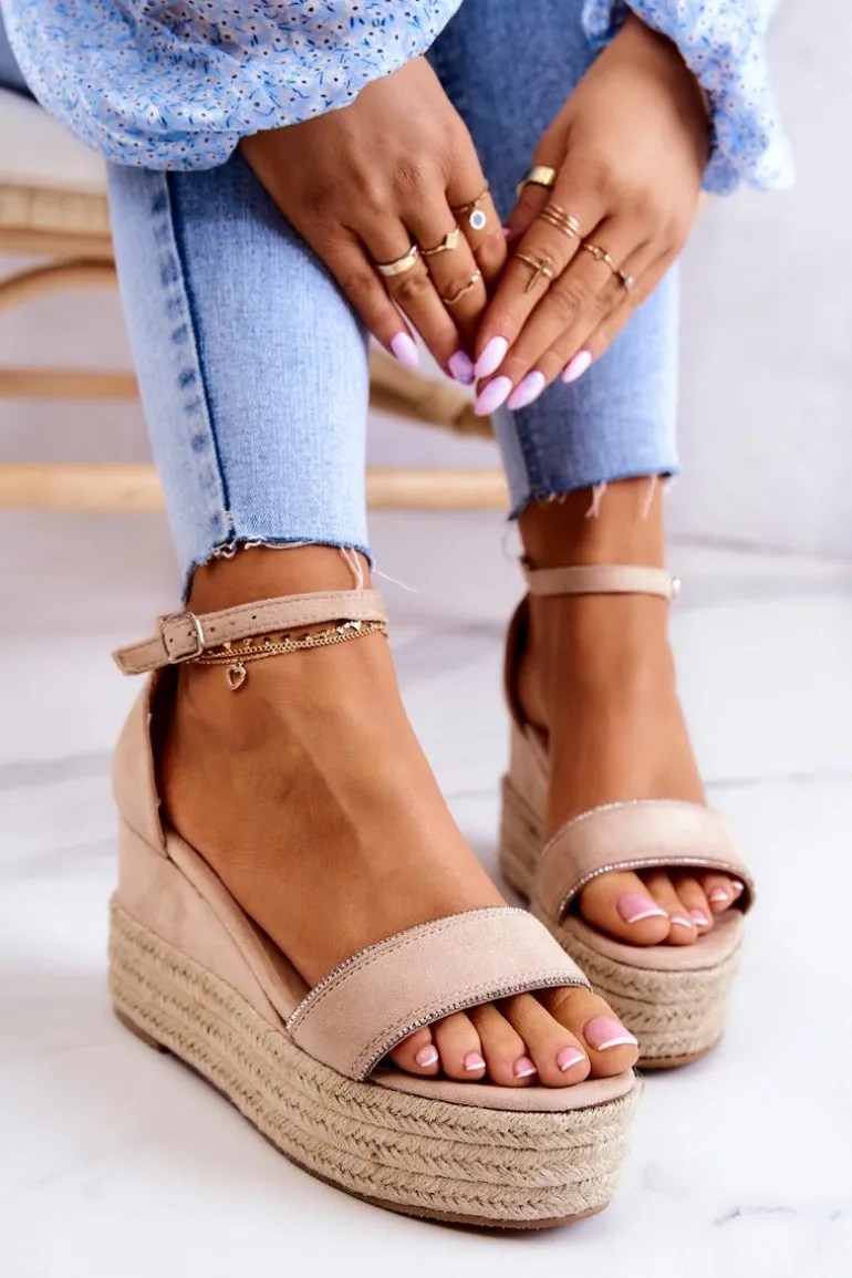 Sandały na koturnie zostały wykonane z eko zamszu. Posiadają paseczek z ozdobą imitującą cyrkonie. Stabilny koturn oraz platforma zdobiona jutowym warkoczem. Zapinane wokół kostki na sprzączkę z regulowanym paskiem. Eko skórzana wkładka zapewni komfort przez cały dzień. Podeszwa wykonana z gumowego tworzywa, która jest antypoślizgowa. Uzupełnij swoje stylizacje o te wspaniałe sandały. Przy wyborze rozmiaru prosimy sugerować się tabelą rozmiarów.