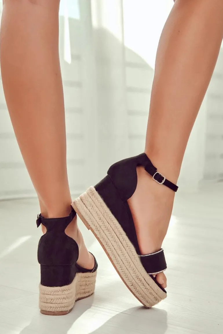 Sandały na koturnie zostały wykonane z eko zamszu. Posiadają paseczek z ozdobą imitującą cyrkonie. Stabilny koturn oraz platforma zdobiona jutowym warkoczem. Zapinane wokół kostki na sprzączkę z regulowanym paskiem. Eko skórzana wkładka zapewni komfort przez cały dzień. Podeszwa wykonana z gumowego tworzywa, która jest antypoślizgowa. Uzupełnij swoje stylizacje o te wspaniałe sandały. Przy wyborze rozmiaru prosimy sugerować się tabelą rozmiarów.