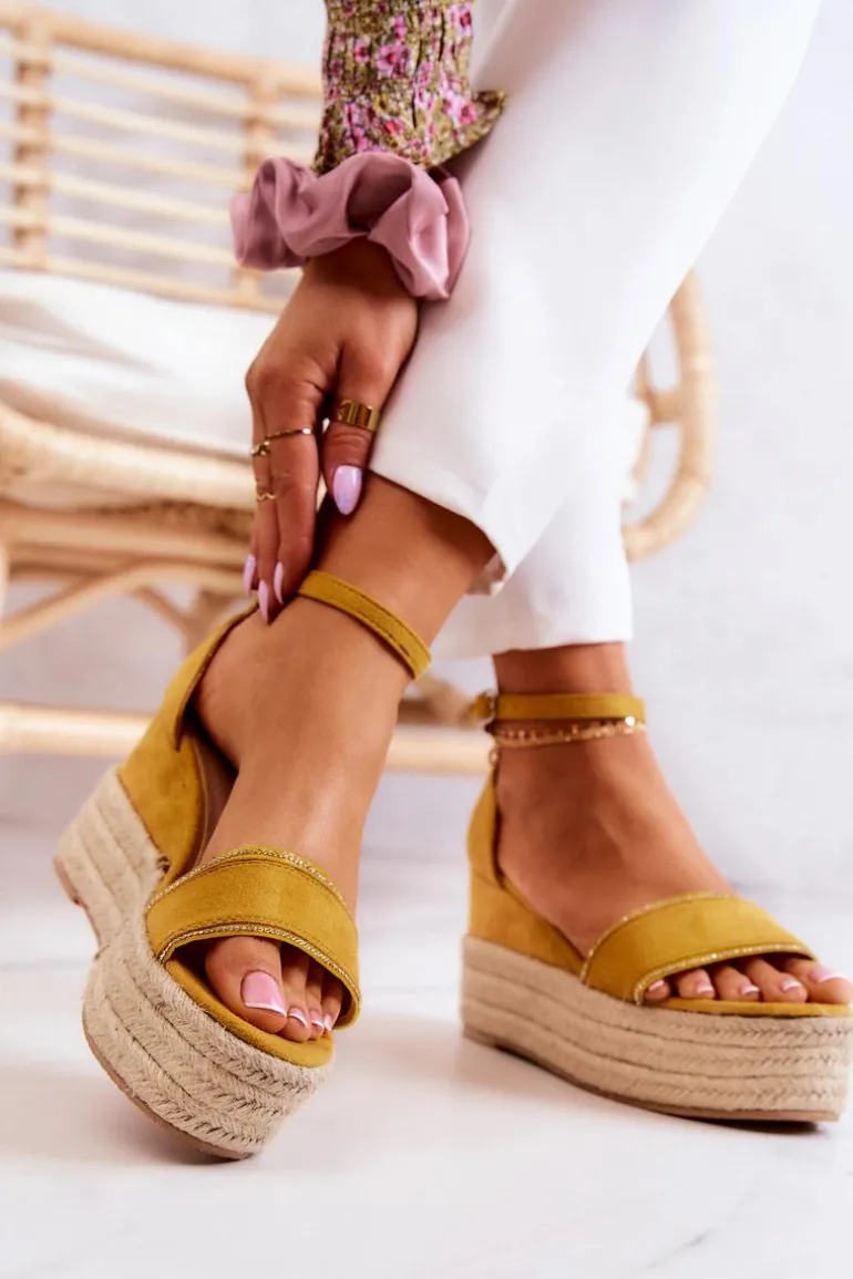 Sandały na koturnie zostały wykonane z eko zamszu. Posiadają paseczek z ozdobą imitującą cyrkonie. Stabilny koturn oraz platforma zdobiona jutowym warkoczem. Zapinane wokół kostki na sprzączkę z regulowanym paskiem. Eko skórzana wkładka zapewni komfort przez cały dzień. Podeszwa wykonana z gumowego tworzywa, która jest antypoślizgowa. Uzupełnij swoje stylizacje o te wspaniałe sandały. Przy wyborze rozmiaru prosimy sugerować się tabelą rozmiarów.