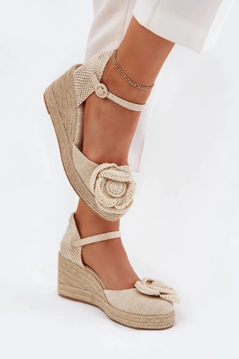 Sandały damskie wykonane z materiału tekstylnego, osadzone na koturnie z plecionką, to stylowa i wygodna opcja na letnie dni. Zakryte noski dodają elegancji, a szydełkowy kwiat z przodu przyciąga wzrok, nadając im wyjątkowego uroku. Zapinane na sprzączkę z regulowanym paskiem, zapewniają idealne dopasowanie do stopy. Doskonałe do letnich stylizacji, łączą komfort z modnym wyglądem. Przy wyborze rozmiaru prosimy sugerować się tabelą rozmiarów.