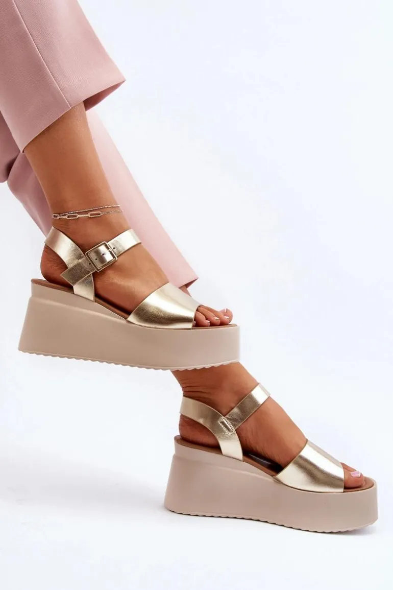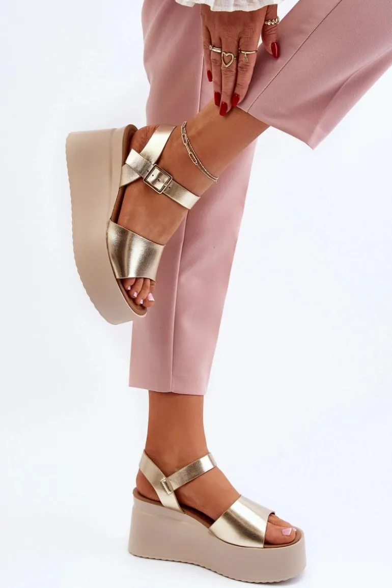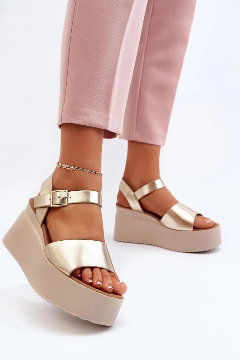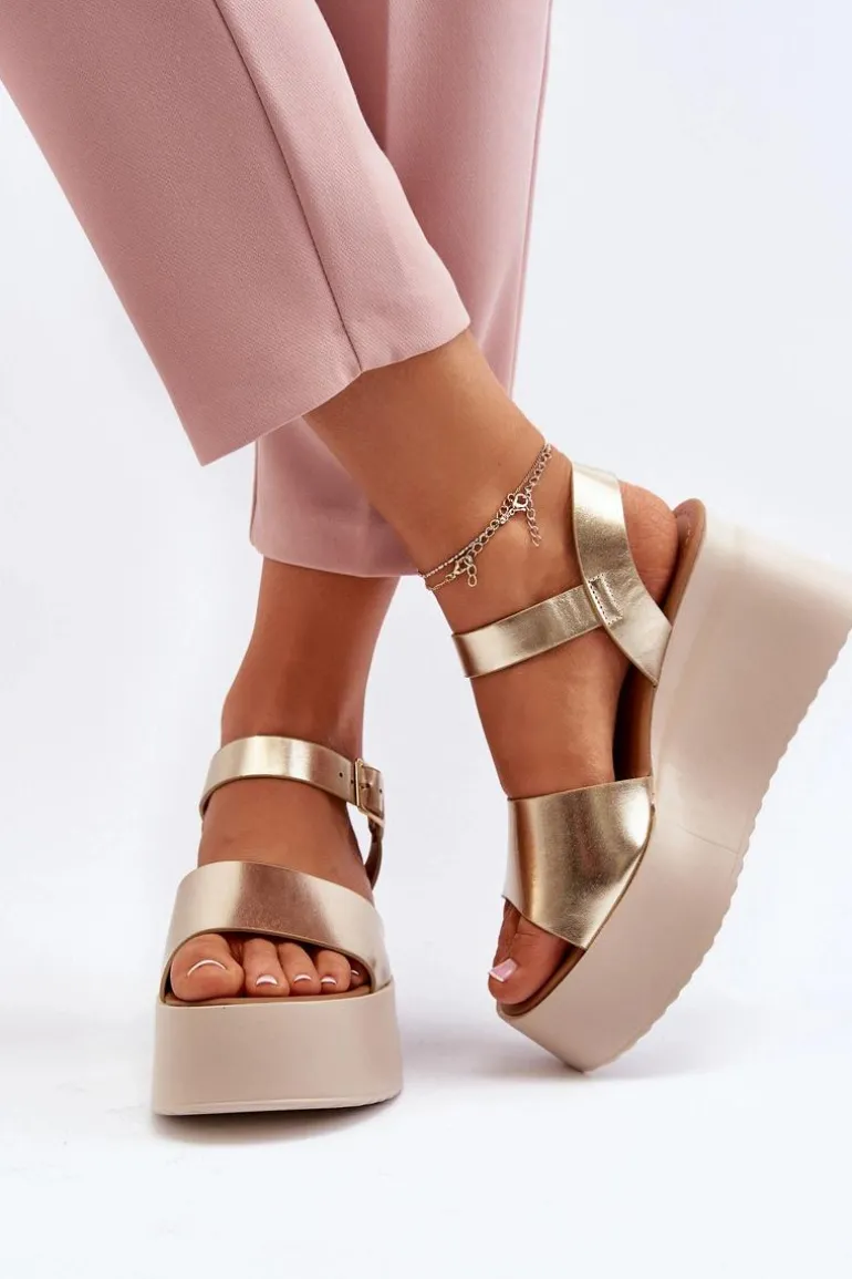 Damskie Sandały Na Koturnie Złote Geferia