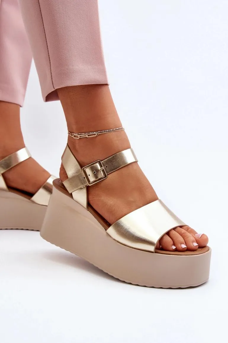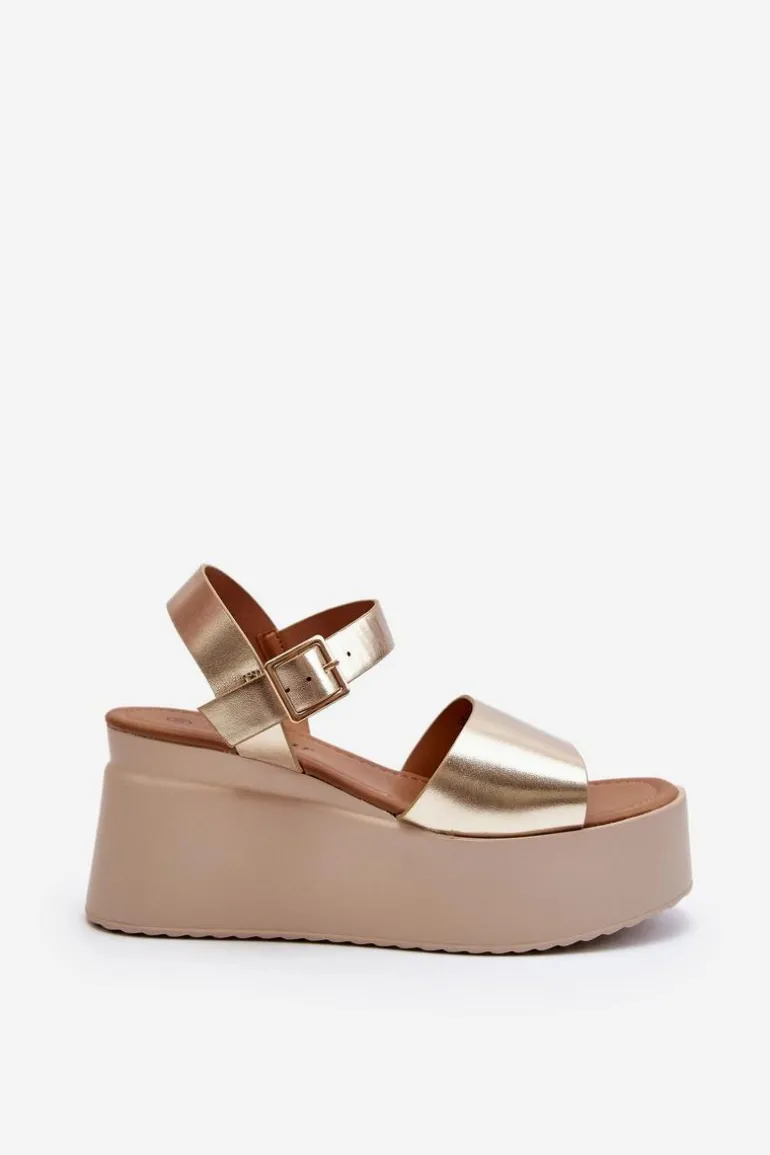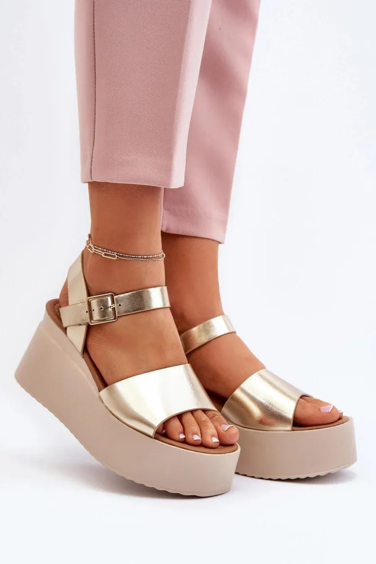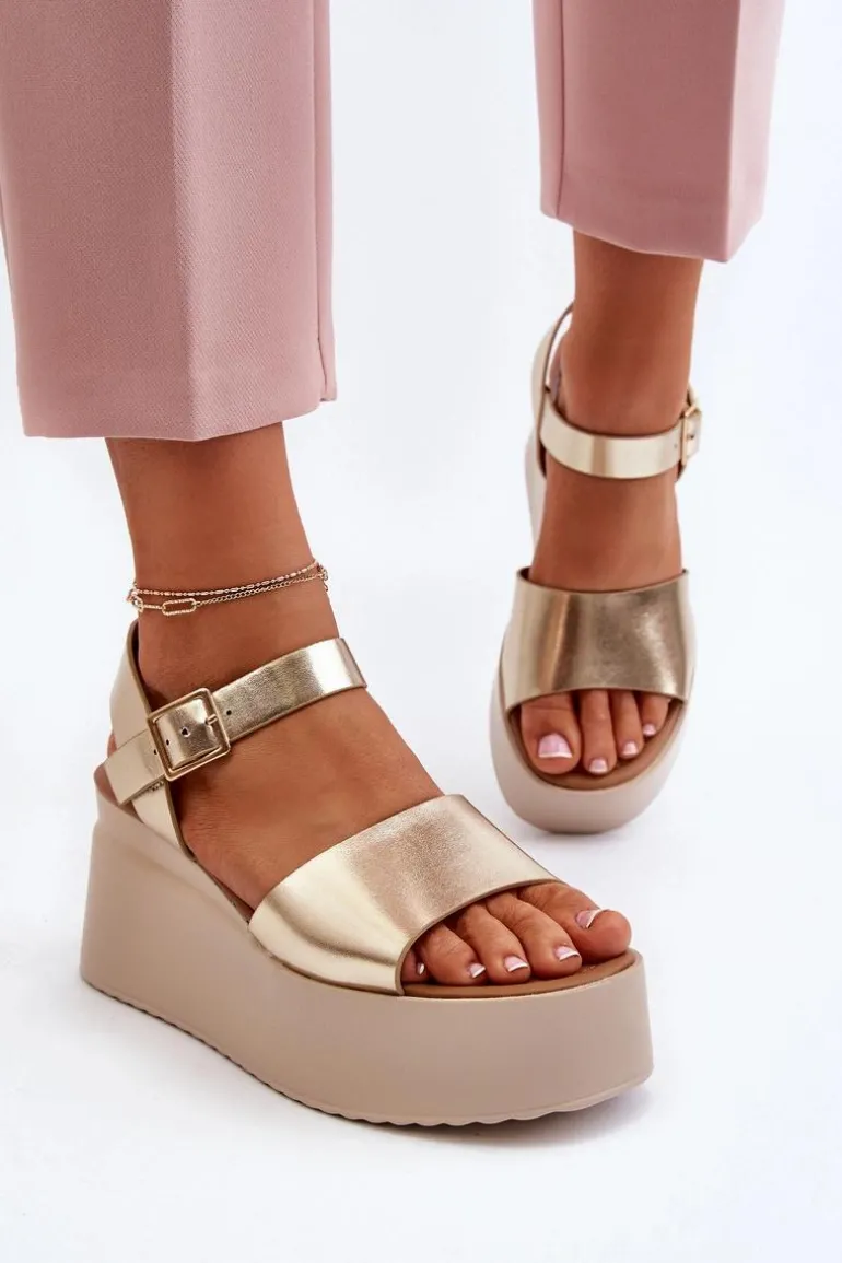 Damskie Sandały Na Koturnie Złote Geferia